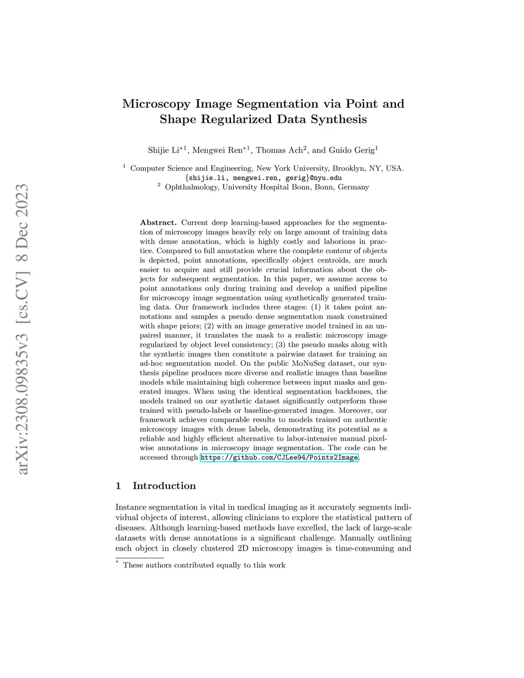 Microscopy Image Segmentation via Point and Shape Regularized Data