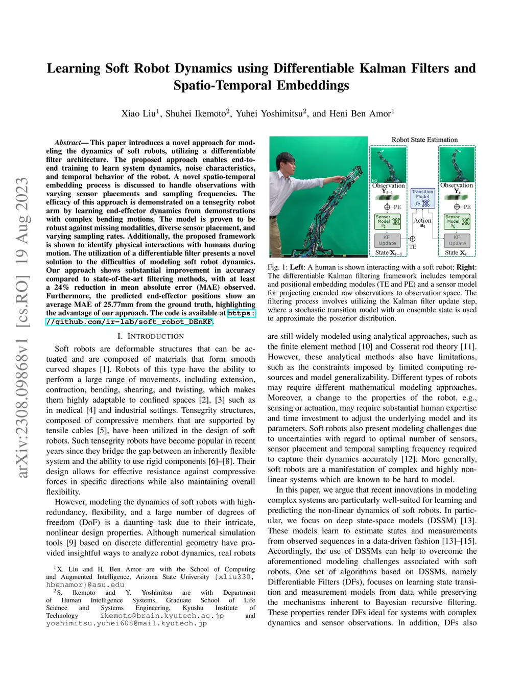 This paper introduces a novel approach for modeling the dynamics of soft robots, utilizing a differentiable filter architecture. The proposed approach enables end-to-end training to learn system dynamics, noise characteristics, and temporal behavior of the robot. A novel spatio-temporal embedding process is discussed to handle observations with varying sensor placements and sampling frequencies. The efficacy of this approach is demonstrated on a tensegrity robot arm by learning end-effector dynamics from demonstrations with complex bending motions. The model is proven to be robust against missing modalities, diverse sensor placement, and varying sampling rates. Additionally, the proposed framework is shown to identify physical interactions with humans during motion. The utilization of a differentiable filter presents a novel solution to the difficulties of modeling soft robot dynamics. Our approach shows substantial improvement in accuracy compared to state-of-the-art filtering methods, with at least a 24% reduction in mean absolute error (MAE) observed. Furthermore, the predicted end-effector positions show an average MAE of 25.77mm from the ground truth, highlighting the advantage of our approach. The code is available at https://github.com/ir-lab/soft_robot_DEnKF.