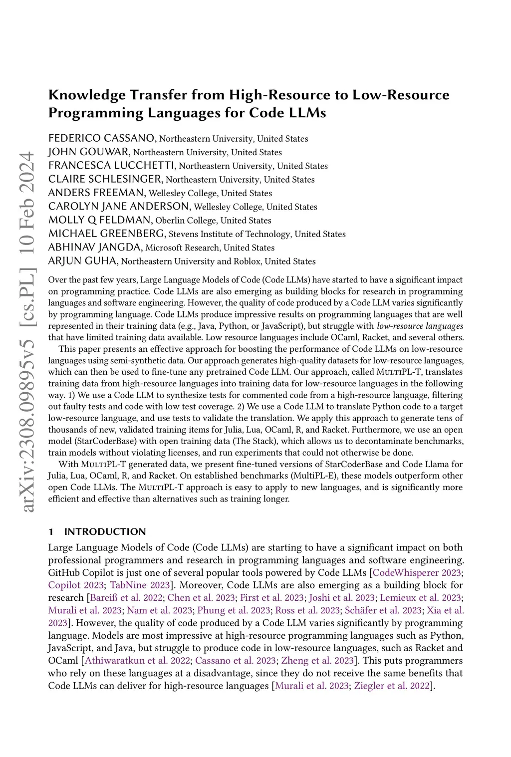 Over the past few years, Large Language Models of Code (Code LLMs) have started to have a significant impact on programming practice. Code LLMs are also emerging as building blocks for research in programming languages and software engineering. However, Code LLMs produce impressive results on programming languages that are well represented in their training data (e.g., Java, Python, or JavaScript), but struggle with low-resource languages that have limited training data available. Low resource languages include OCaml, Racket, and several others. This paper presents an effective approach for boosting the performance of Code LLMs on low-resource languages using semi-synthetic data. Our approach, MultiPL-T, translates training data from high-resource languages into training data for low-resource languages in the following way. 1) We use a Code LLM to synthesize tests for commented code from a high-resource language, filtering out faulty tests and code with low test coverage. 2) We use a Code LLM to translate Python code to a target low-resource language, and use tests to validate the translation. We apply this approach to generate tens of thousands of validated training items for Julia, Lua, OCaml, R, and Racket. Furthermore, we use an open model (StarCoderBase) with open training data (The Stack), which allows us to decontaminate benchmarks, train models without violating licenses, and run experiments that could not otherwise be done. With MultiPL-T generated data, we present fine-tuned versions of StarCoderBase and Code Llama for Julia, Lua, OCaml, R, and Racket. On established benchmarks (MultiPL-E), these models outperform other open Code LLMs. The MultiPL-T approach is easy to apply to new languages, and is significantly more efficient and effective than alternatives such as training longer.