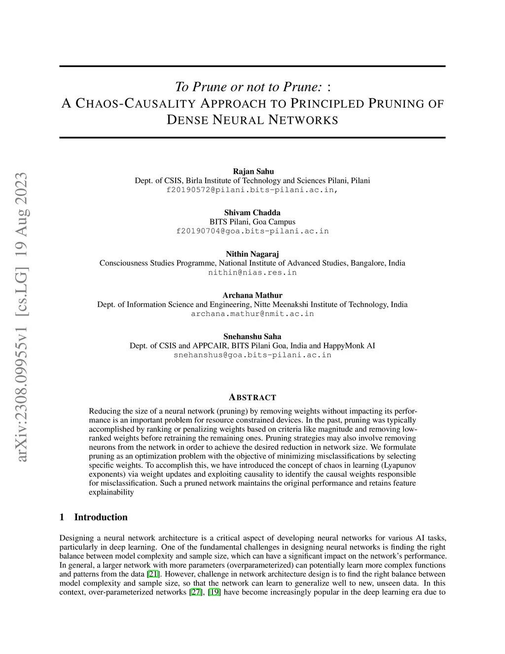 Reducing the size of a neural network (pruning) by removing weights without impacting its performance is an important problem for resource-constrained devices. In the past, pruning was typically accomplished by ranking or penalizing weights based on criteria like magnitude and removing low-ranked weights before retraining the remaining ones. Pruning strategies may also involve removing neurons from the network in order to achieve the desired reduction in network size. We formulate pruning as an optimization problem with the objective of minimizing misclassifications by selecting specific weights. To accomplish this, we have introduced the concept of chaos in learning (Lyapunov exponents) via weight updates and exploiting causality to identify the causal weights responsible for misclassification. Such a pruned network maintains the original performance and retains feature explainability.