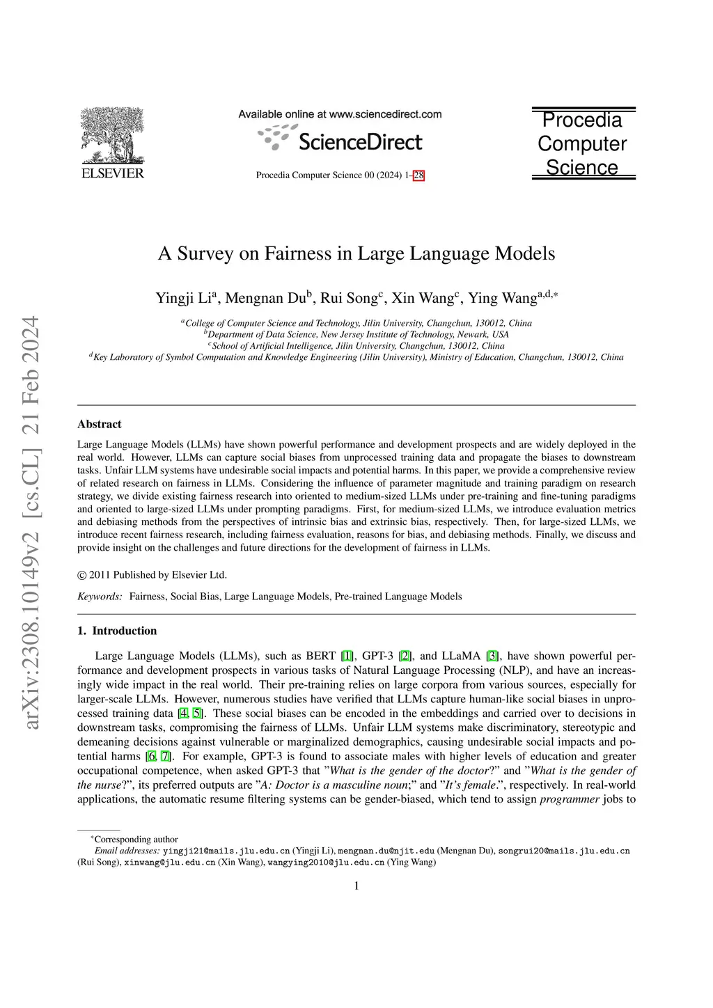 Large Language Models (LLMs) have shown powerful performance and development prospects and are widely deployed in the real world. However, LLMs can capture social biases from unprocessed training data and propagate the biases to downstream tasks. Unfair LLM systems have undesirable social impacts and potential harms. In this paper, we provide a comprehensive review of related research on fairness in LLMs. Considering the influence of parameter magnitude and training paradigm on research strategy, we divide existing fairness research into oriented to medium-sized LLMs under pre-training and fine-tuning paradigms and oriented to large-sized LLMs under prompting paradigms. First, for medium-sized LLMs, we introduce evaluation metrics and debiasing methods from the perspectives of intrinsic bias and extrinsic bias, respectively. Then, for large-sized LLMs, we introduce recent fairness research, including fairness evaluation, reasons for bias, and debiasing methods. Finally, we discuss and provide insight on the challenges and future directions for the development of fairness in LLMs.