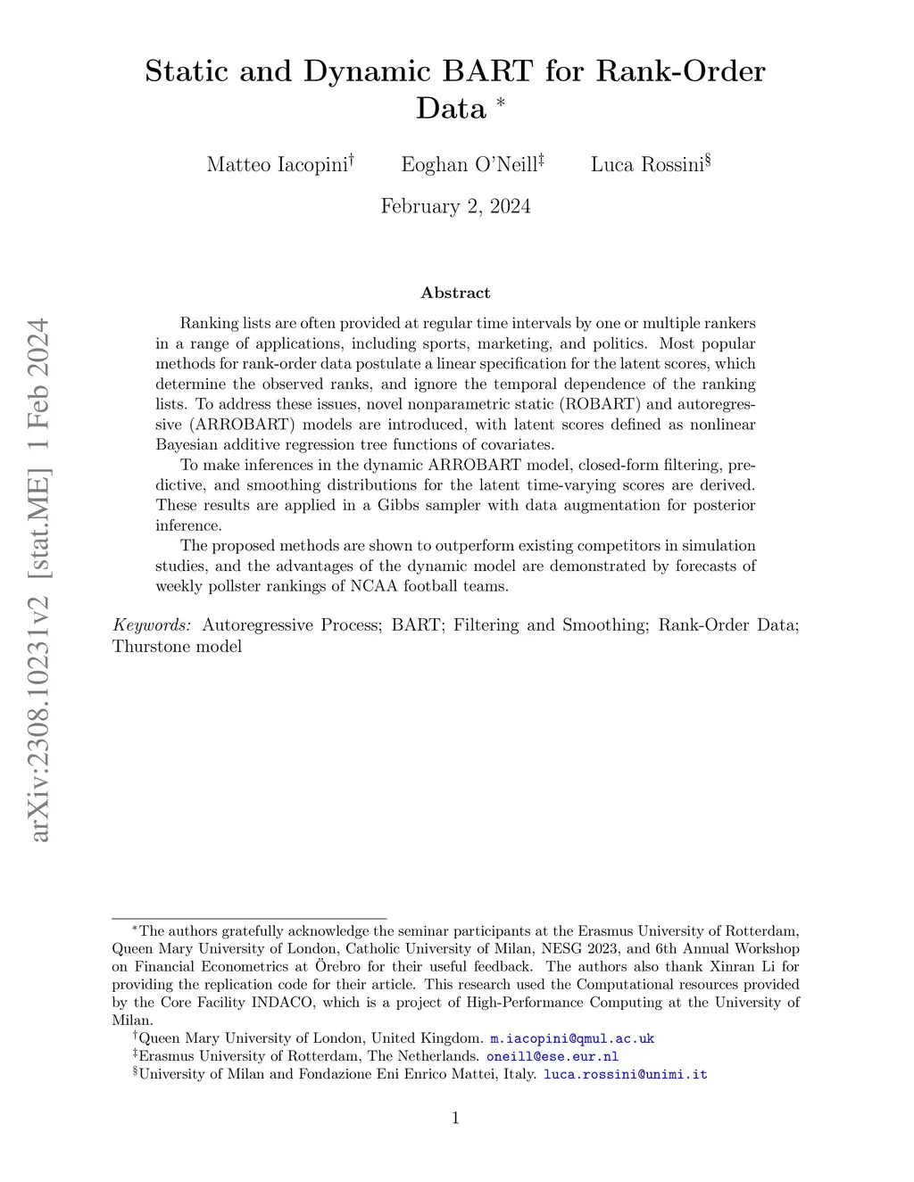 Ranking lists are often provided at regular time intervals by one or multiple rankers in a range of applications, including sports, marketing, and politics. Most popular methods for rank-order data postulate a linear specification for the latent scores, which determine the observed ranks, and ignore the temporal dependence of the ranking lists. To address these issues, novel nonparametric static (ROBART) and autoregressive (ARROBART) models are introduced, with latent scores defined as nonlinear Bayesian additive regression tree functions of covariates. To make inferences in the dynamic ARROBART model, closed-form filtering, predictive, and smoothing distributions for the latent time-varying scores are derived. These results are applied in a Gibbs sampler with data augmentation for posterior inference. The proposed methods are shown to outperform existing competitors in simulation studies, and the advantages of the dynamic model are demonstrated by forecasts of weekly pollster rankings of NCAA football teams.