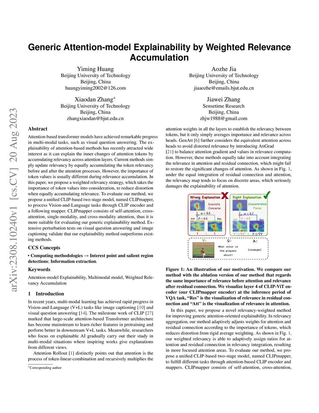Attention-based transformer models have achieved remarkable progress in multi-modal tasks, such as visual question answering. The explainability of attention-based methods has recently attracted wide interest as it can explain the inner changes of attention tokens by accumulating relevancy across attention layers. Current methods simply update relevancy by equally accumulating the token relevancy before and after the attention processes. However, the importance of token values is usually different during relevance accumulation. In this paper, we propose a weighted relevancy strategy, which takes the importance of token values into consideration, to reduce distortion when equally accumulating relevance. To evaluate our method, we propose a unified CLIP-based two-stage model, named CLIPmapper, to process Vision-and-Language tasks through CLIP encoder and a following mapper. CLIPmapper consists of self-attention, cross-attention, single-modality, and cross-modality attention, thus it is more suitable for evaluating our generic explainability method. Extensive perturbation tests on visual question answering and image captioning validate that our explainability method outperforms existing methods.