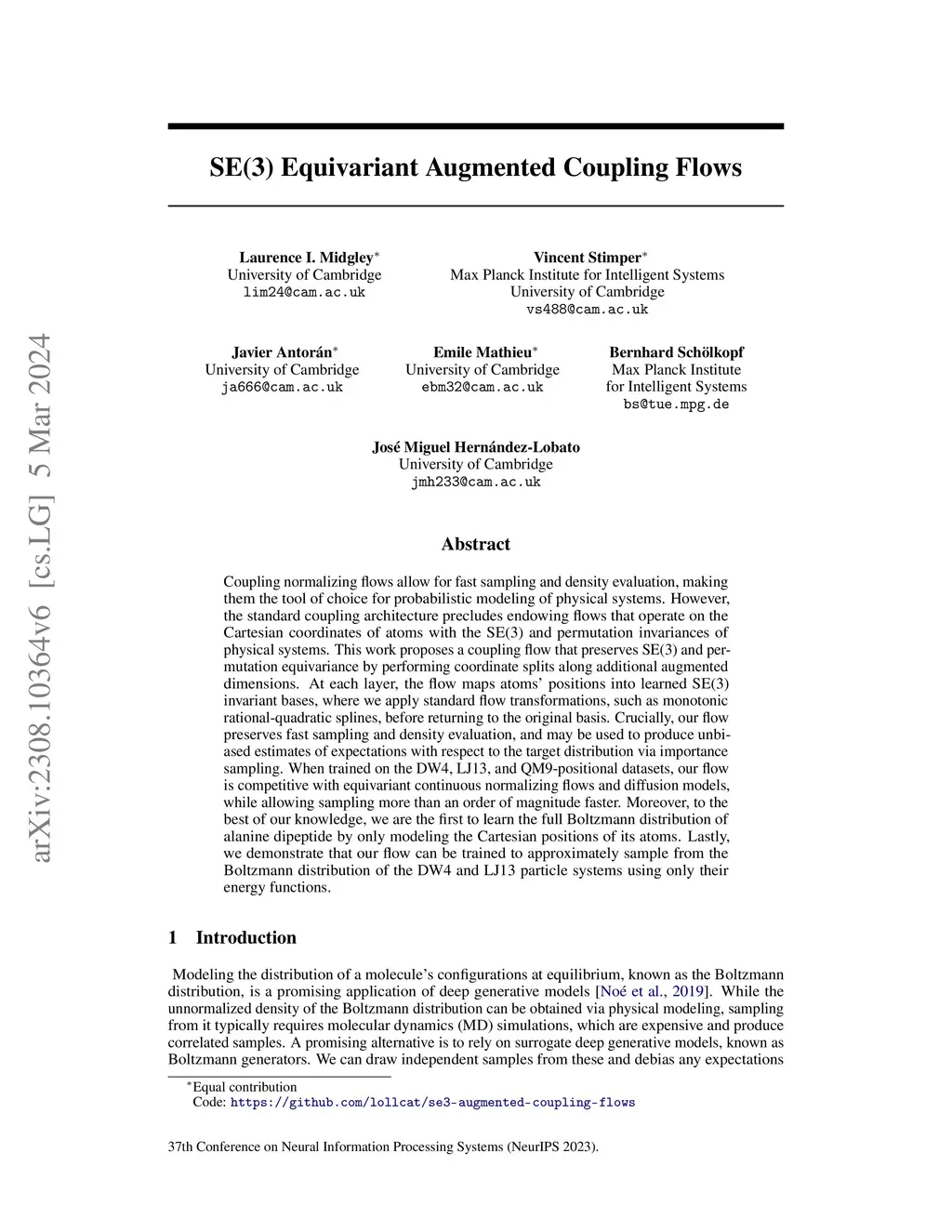 Coupling normalizing flows allow for fast sampling and density evaluation, making them the tool of choice for probabilistic modeling of physical systems. However, the standard coupling architecture precludes endowing flows that operate on the Cartesian coordinates of atoms with the SE(3) and permutation invariances of physical systems. This work proposes a coupling flow that preserves SE(3) and permutation equivariance by performing coordinate splits along additional augmented dimensions. At each layer, the flow maps atoms' positions into learned SE(3) invariant bases, where we apply standard flow transformations, such as monotonic rational-quadratic splines, before returning to the original basis. Crucially, our flow preserves fast sampling and density evaluation, and may be used to produce unbiased estimates of expectations with respect to the target distribution via importance sampling. When trained on the DW4, LJ13, and QM9-positional datasets, our flow is competitive with equivariant continuous normalizing flows and diffusion models, while allowing sampling more than an order of magnitude faster. Moreover, to the best of our knowledge, we are the first to learn the full Boltzmann distribution of alanine dipeptide by only modeling the Cartesian positions of its atoms. Lastly, we demonstrate that our flow can be trained to approximately sample from the Boltzmann distribution of the DW4 and LJ13 particle systems using only their energy functions.