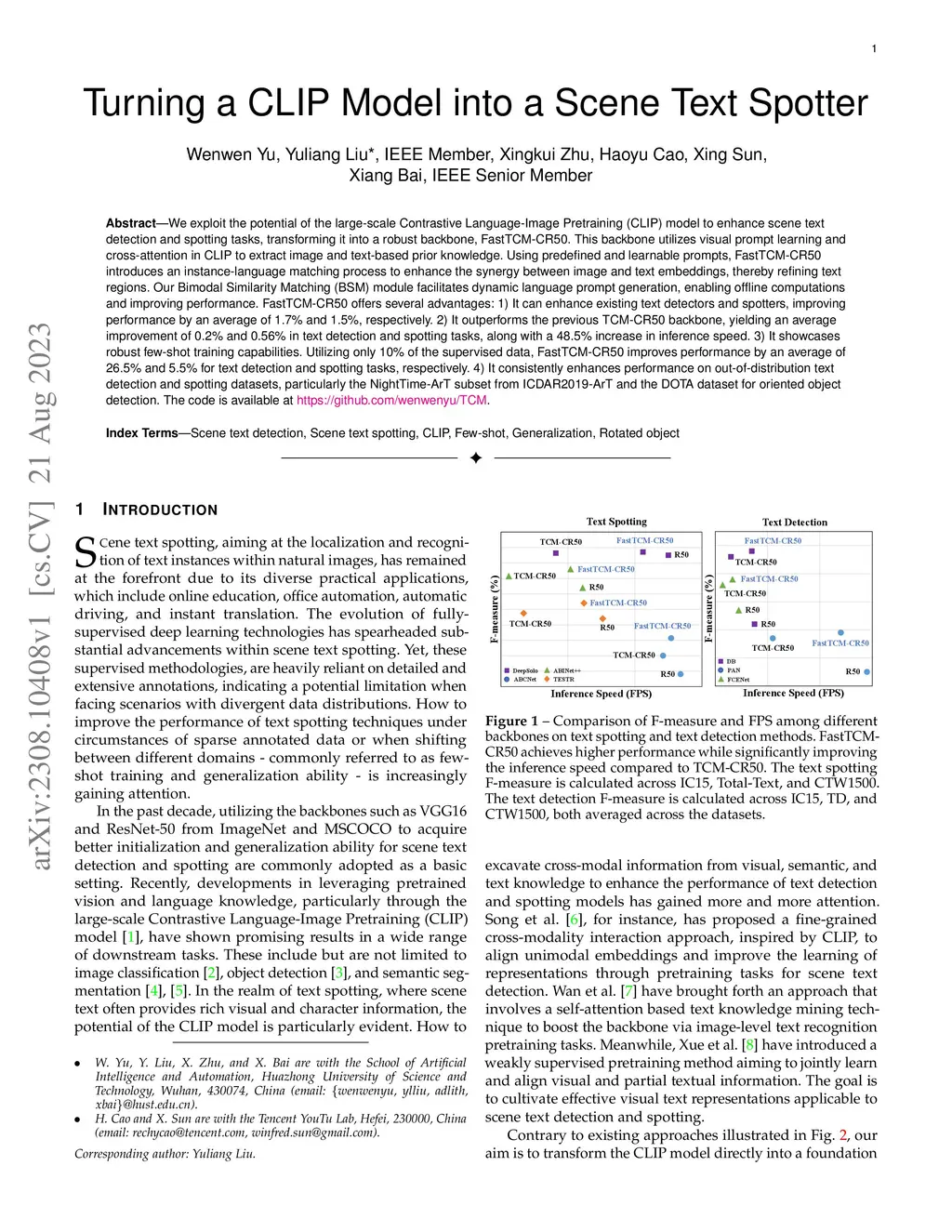 We exploit the potential of the large-scale Contrastive Language-Image Pretraining (CLIP) model to enhance scene text detection and spotting tasks, transforming it into a robust backbone, FastTCM-CR50. This backbone utilizes visual prompt learning and cross-attention in CLIP to extract image and text-based prior knowledge. Using predefined and learnable prompts, FastTCM-CR50 introduces an instance-language matching process to enhance the synergy between image and text embeddings, thereby refining text regions. Our Bimodal Similarity Matching (BSM) module facilitates dynamic language prompt generation, enabling offline computations and improving performance. FastTCM-CR50 offers several advantages: 1) It can enhance existing text detectors and spotters, improving performance by an average of 1.7% and 1.5%, respectively. 2) It outperforms the previous TCM-CR50 backbone, yielding an average improvement of 0.2% and 0.56% in text detection and spotting tasks, along with a 48.5% increase in inference speed. 3) It showcases robust few-shot training capabilities. Utilizing only 10% of the supervised data, FastTCM-CR50 improves performance by an average of 26.5% and 5.5% for text detection and spotting tasks, respectively. 4) It consistently enhances performance on out-of-distribution text detection and spotting datasets, particularly the NightTime-ArT subset from ICDAR2019-ArT and the DOTA dataset for oriented object detection. The code is available at https://github.com/wenwenyu/TCM.