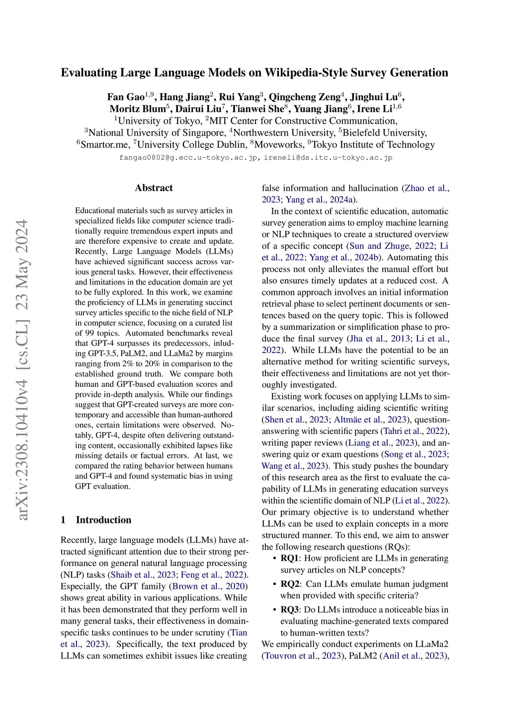 Educational materials such as survey articles in specialized fields like computer science traditionally require tremendous expert inputs and are therefore expensive to create and update. Recently, Large Language Models (LLMs) have achieved significant success across various general tasks. However, their effectiveness and limitations in the education domain are yet to be fully explored. In this work, we examine the proficiency of LLMs in generating succinct survey articles specific to the niche field of NLP in computer science, focusing on a curated list of 99 topics. Automated benchmarks reveal that GPT-4 surpasses its predecessors, inluding GPT-3.5, PaLM2, and LLaMa2 by margins ranging from 2% to 20% in comparison to the established ground truth. We compare both human and GPT-based evaluation scores and provide in-depth analysis. While our findings suggest that GPT-created surveys are more contemporary and accessible than human-authored ones, certain limitations were observed. Notably, GPT-4, despite often delivering outstanding content, occasionally exhibited lapses like missing details or factual errors. At last, we compared the rating behavior between humans and GPT-4 and found systematic bias in using GPT evaluation.