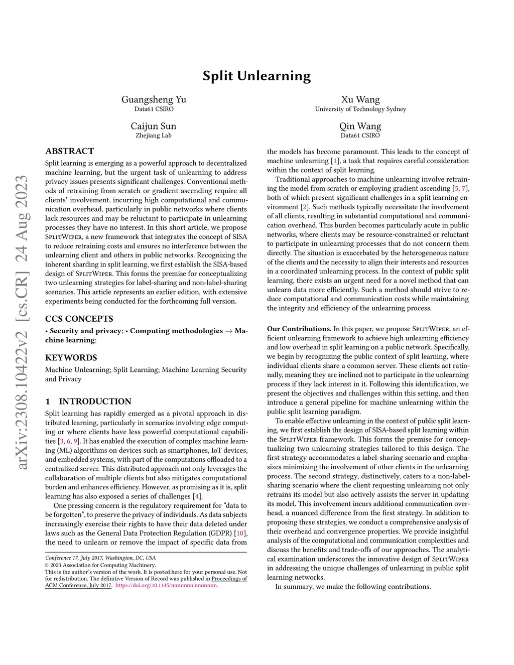 We introduce Split Unlearning, a novel machine unlearning technology designed for Split Learning (SL), enabling the first-ever implementation of Sharded, Isolated, Sliced, and Aggregated (SISA) unlearning in SL frameworks. Particularly, the tight coupling between clients and the server in existing SL frameworks results in frequent bidirectional data flows and iterative training across all clients, violating the "Isolated" principle and making them struggle to implement SISA for independent and efficient unlearning. To address this, we propose SplitWiper with a new one-way-one-off propagation scheme, which leverages the inherently "Sharded" structure of SL and decouples neural signal propagation between clients and the server, enabling effective SISA unlearning even in scenarios with absent clients. We further design SplitWiper+ to enhance client label privacy, which integrates differential privacy and label expansion strategy to defend the privacy of client labels against the server and other potential adversaries. Experiments across diverse data distributions and tasks demonstrate that SplitWiper achieves 0% accuracy for unlearned labels, and 8% better accuracy for retained labels than non-SISA unlearning in SL. Moreover, the one-way-one-off propagation maintains constant overhead, reducing computational and communication costs by 99%. SplitWiper+ preserves 90% of label privacy when sharing masked labels with the server.