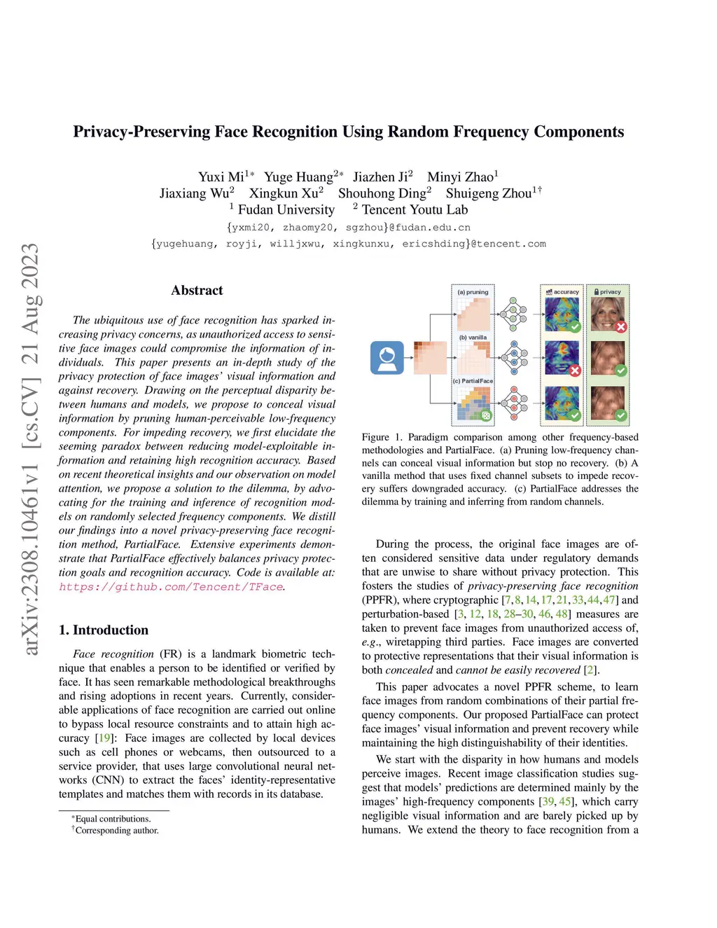 The ubiquitous use of face recognition has sparked increasing privacy concerns, as unauthorized access to sensitive face images could compromise the information of individuals. This paper presents an in-depth study of the privacy protection of face images' visual information and against recovery. Drawing on the perceptual disparity between humans and models, we propose to conceal visual information by pruning human-perceivable low-frequency components. For impeding recovery, we first elucidate the seeming paradox between reducing model-exploitable information and retaining high recognition accuracy. Based on recent theoretical insights and our observation on model attention, we propose a solution to the dilemma, by advocating for the training and inference of recognition models on randomly selected frequency components. We distill our findings into a novel privacy-preserving face recognition method, PartialFace. Extensive experiments demonstrate that PartialFace effectively balances privacy protection goals and recognition accuracy. Code is available at: https://github.com/Tencent/TFace.