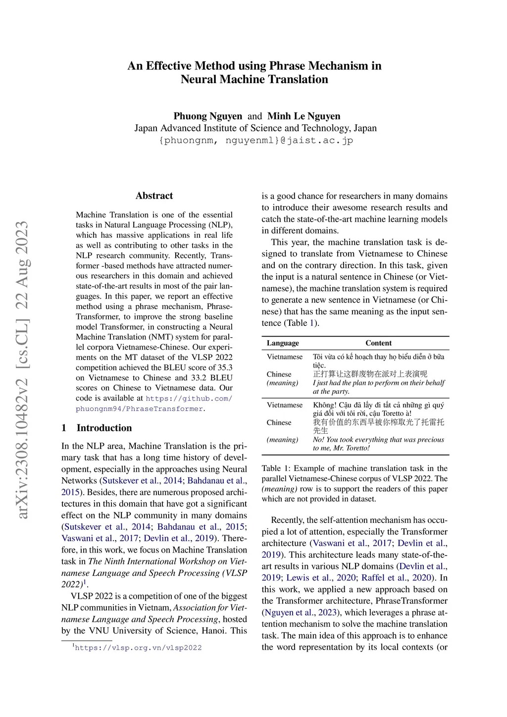 Machine Translation is one of the essential tasks in Natural Language Processing (NLP), which has massive applications in real life as well as contributing to other tasks in the NLP research community. Recently, Transformer -based methods have attracted numerous researchers in this domain and achieved state-of-the-art results in most of the pair languages. In this paper, we report an effective method using a phrase mechanism, PhraseTransformer, to improve the strong baseline model Transformer in constructing a Neural Machine Translation (NMT) system for parallel corpora Vietnamese-Chinese. Our experiments on the MT dataset of the VLSP 2022 competition achieved the BLEU score of 35.3 on Vietnamese to Chinese and 33.2 BLEU scores on Chinese to Vietnamese data. Our code is available at https://github.com/phuongnm94/PhraseTransformer.