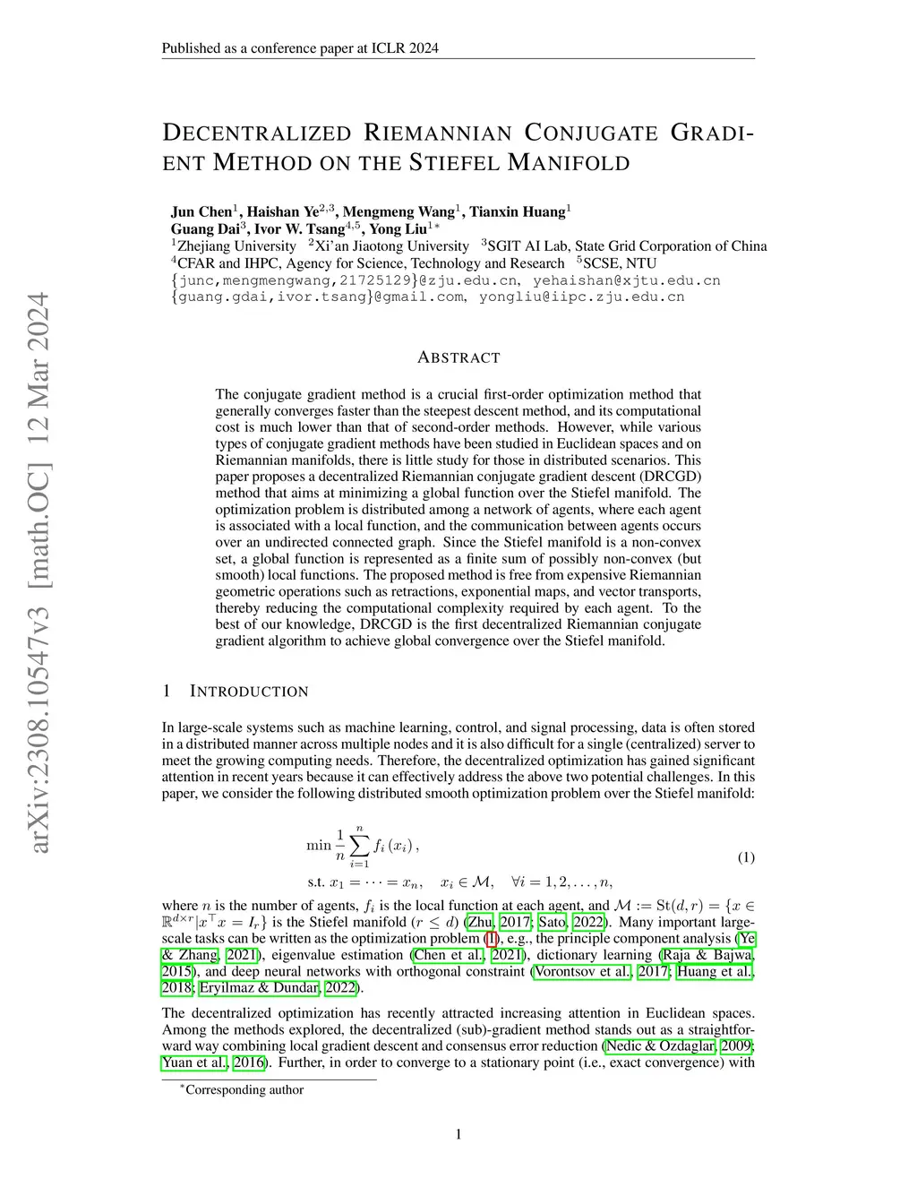 The conjugate gradient method is a crucial first-order optimization method that generally converges faster than the steepest descent method, and its computational cost is much lower than that of second-order methods. However, while various types of conjugate gradient methods have been studied in Euclidean spaces and on Riemannian manifolds, there is little study for those in distributed scenarios. This paper proposes a decentralized Riemannian conjugate gradient descent (DRCGD) method that aims at minimizing a global function over the Stiefel manifold. The optimization problem is distributed among a network of agents, where each agent is associated with a local function, and the communication between agents occurs over an undirected connected graph. Since the Stiefel manifold is a non-convex set, a global function is represented as a finite sum of possibly non-convex (but smooth) local functions. The proposed method is free from expensive Riemannian geometric operations such as retractions, exponential maps, and vector transports, thereby reducing the computational complexity required by each agent. To the best of our knowledge, DRCGD is the first decentralized Riemannian conjugate gradient algorithm to achieve global convergence over the Stiefel manifold.