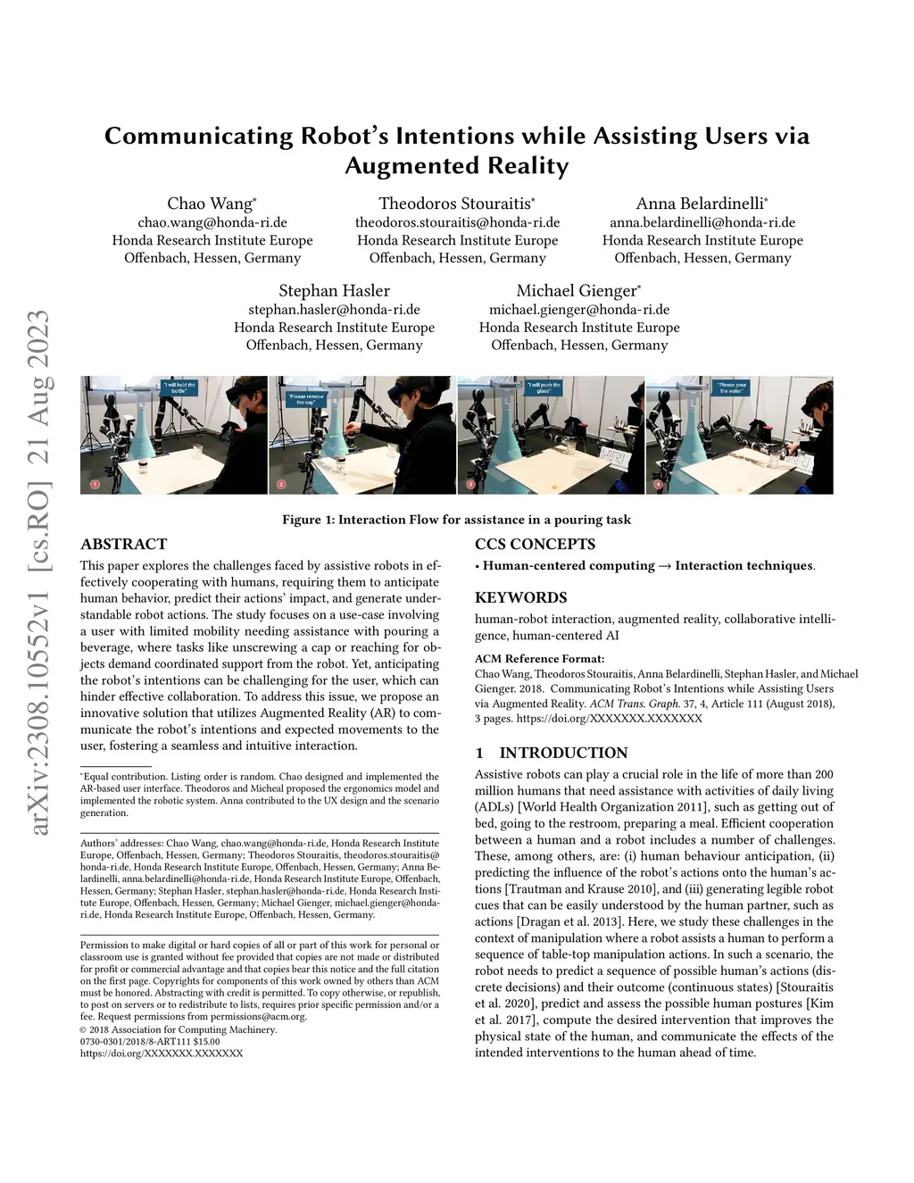 This paper explores the challenges faced by assistive robots in effectively cooperating with humans, requiring them to anticipate human behavior, predict their actions' impact, and generate understandable robot actions. The study focuses on a use-case involving a user with limited mobility needing assistance with pouring a beverage, where tasks like unscrewing a cap or reaching for objects demand coordinated support from the robot. Yet, anticipating the robot's intentions can be challenging for the user, which can hinder effective collaboration. To address this issue, we propose an innovative solution that utilizes Augmented Reality (AR) to communicate the robot's intentions and expected movements to the user, fostering a seamless and intuitive interaction.