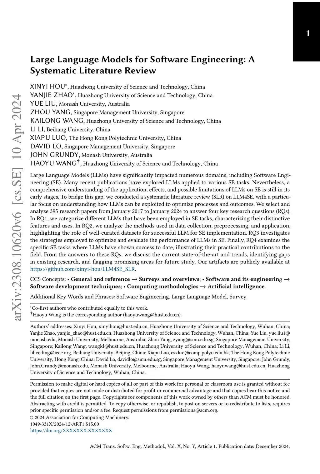 Large Language Models (LLMs) have significantly impacted numerous domains, including Software Engineering (SE). Many recent publications have explored LLMs applied to various SE tasks. Nevertheless, a comprehensive understanding of the application, effects, and possible limitations of LLMs on SE is still in its early stages. To bridge this gap, we conducted a systematic literature review (SLR) on LLM4SE, with a particular focus on understanding how LLMs can be exploited to optimize processes and outcomes. We select and analyze 395 research papers from January 2017 to January 2024 to answer four key research questions (RQs). In RQ1, we categorize different LLMs that have been employed in SE tasks, characterizing their distinctive features and uses. In RQ2, we analyze the methods used in data collection, preprocessing, and application, highlighting the role of well-curated datasets for successful LLM for SE implementation. RQ3 investigates the strategies employed to optimize and evaluate the performance of LLMs in SE. Finally, RQ4 examines the specific SE tasks where LLMs have shown success to date, illustrating their practical contributions to the field. From the answers to these RQs, we discuss the current state-of-the-art and trends, identifying gaps in existing research, and flagging promising areas for future study. Our artifacts are publicly available at https://github.com/xinyi-hou/LLM4SE_SLR.