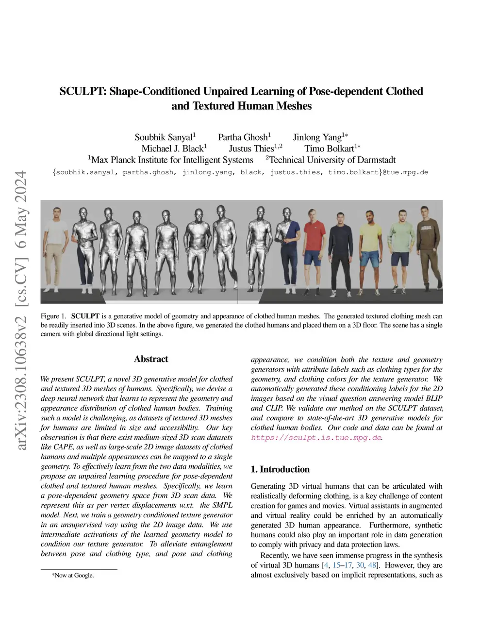 We present SCULPT, a novel 3D generative model for clothed and textured 3D meshes of humans. Specifically, we devise a deep neural network that learns to represent the geometry and appearance distribution of clothed human bodies. Training such a model is challenging, as datasets of textured 3D meshes for humans are limited in size and accessibility. Our key observation is that there exist medium-sized 3D scan datasets like CAPE, as well as large-scale 2D image datasets of clothed humans and multiple appearances can be mapped to a single geometry. To effectively learn from the two data modalities, we propose an unpaired learning procedure for pose-dependent clothed and textured human meshes. Specifically, we learn a pose-dependent geometry space from 3D scan data. We represent this as per vertex displacements w.r.t. the SMPL model. Next, we train a geometry conditioned texture generator in an unsupervised way using the 2D image data. We use intermediate activations of the learned geometry model to condition our texture generator. To alleviate entanglement between pose and clothing type, and pose and clothing appearance, we condition both the texture and geometry generators with attribute labels such as clothing types for the geometry, and clothing colors for the texture generator. We automatically generated these conditioning labels for the 2D images based on the visual question answering model BLIP and CLIP. We validate our method on the SCULPT dataset, and compare to state-of-the-art 3D generative models for clothed human bodies. Our code and data can be found at https://sculpt.is.tue.mpg.de.