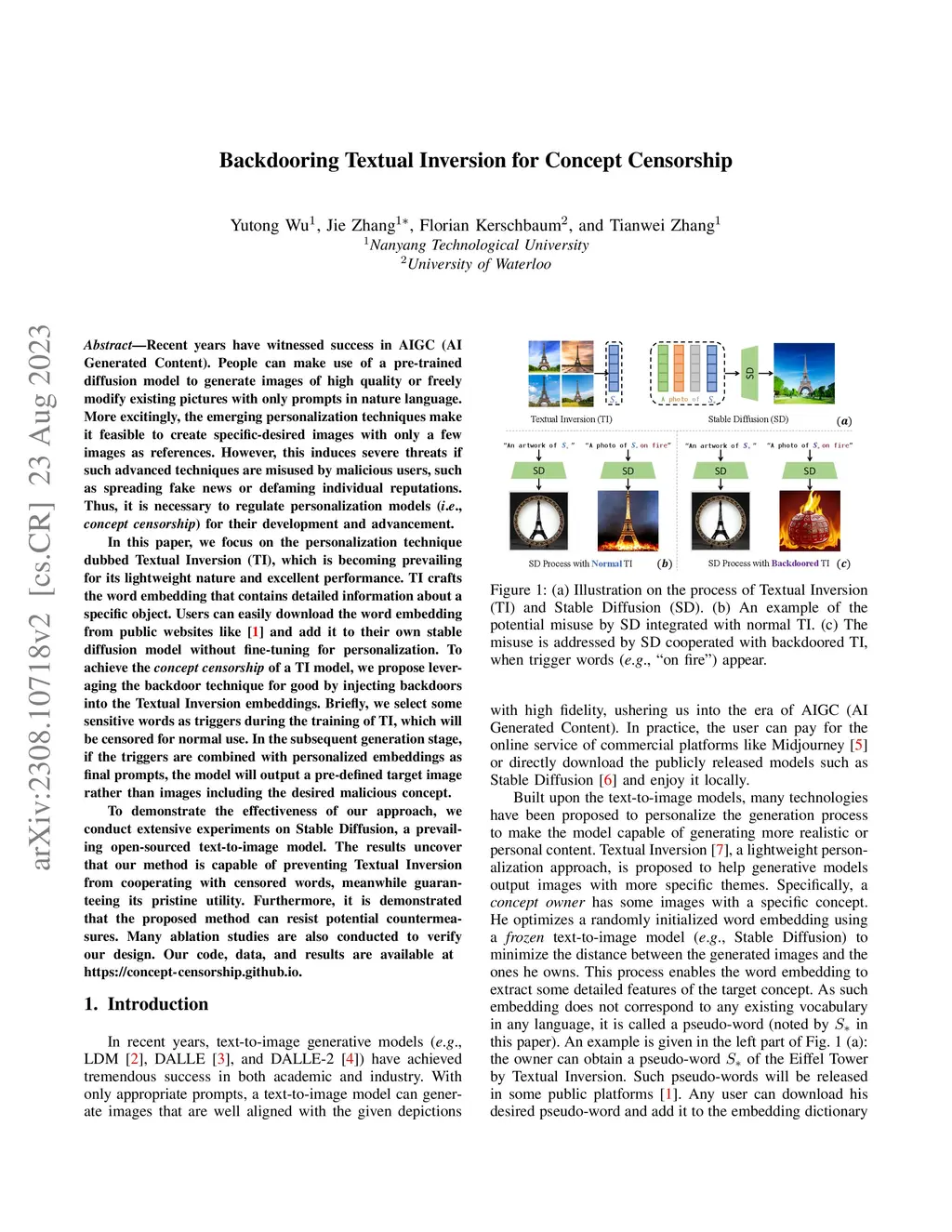 Recent years have witnessed success in AIGC (AI Generated Content). People can make use of a pre-trained diffusion model to generate images of high quality or freely modify existing pictures with only prompts in nature language. More excitingly, the emerging personalization techniques make it feasible to create specific-desired images with only a few images as references. However, this induces severe threats if such advanced techniques are misused by malicious users, such as spreading fake news or defaming individual reputations. Thus, it is necessary to regulate personalization models (i.e., concept censorship) for their development and advancement. In this paper, we focus on the personalization technique dubbed Textual Inversion (TI), which is becoming prevailing for its lightweight nature and excellent performance. TI crafts the word embedding that contains detailed information about a specific object. Users can easily download the word embedding from public websites like Civitai and add it to their own stable diffusion model without fine-tuning for personalization. To achieve the concept censorship of a TI model, we propose leveraging the backdoor technique for good by injecting backdoors into the Textual Inversion embeddings. Briefly, we select some sensitive words as triggers during the training of TI, which will be censored for normal use. In the subsequent generation stage, if the triggers are combined with personalized embeddings as final prompts, the model will output a pre-defined target image rather than images including the desired malicious concept. To demonstrate the effectiveness of our approach, we conduct extensive experiments on Stable Diffusion, a prevailing open-sourced text-to-image model. Our code, data, and results are available at https://concept-censorship.github.io.