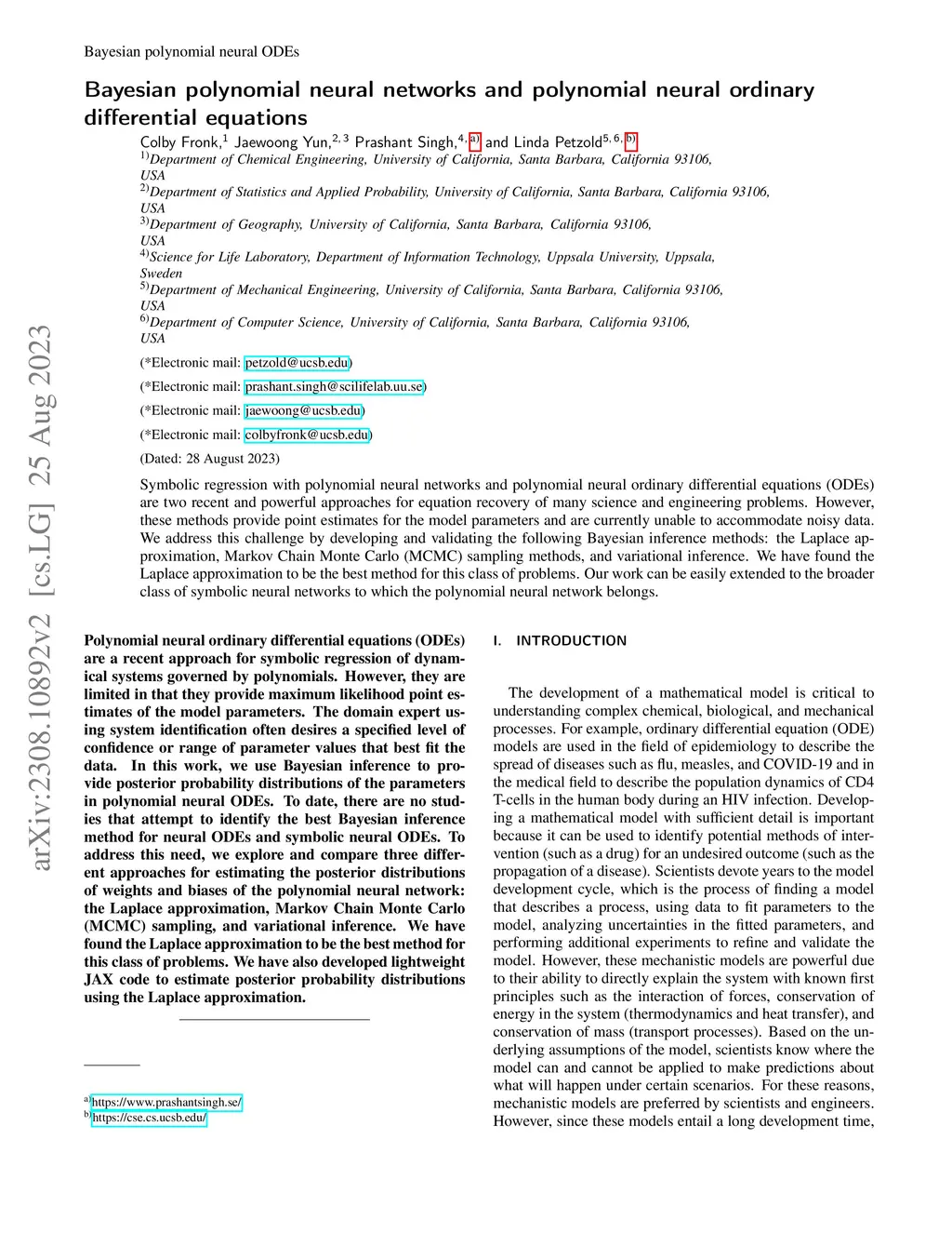 Symbolic regression with polynomial neural networks and polynomial neural ordinary differential equations (ODEs) are two recent and powerful approaches for equation recovery of many science and engineering problems. However, these methods provide point estimates for the model parameters and are currently unable to accommodate noisy data. We address this challenge by developing and validating the following Bayesian inference methods: the Laplace approximation, Markov Chain Monte Carlo (MCMC) sampling methods, and variational inference. We have found the Laplace approximation to be the best method for this class of problems. Our work can be easily extended to the broader class of symbolic neural networks to which the polynomial neural network belongs.