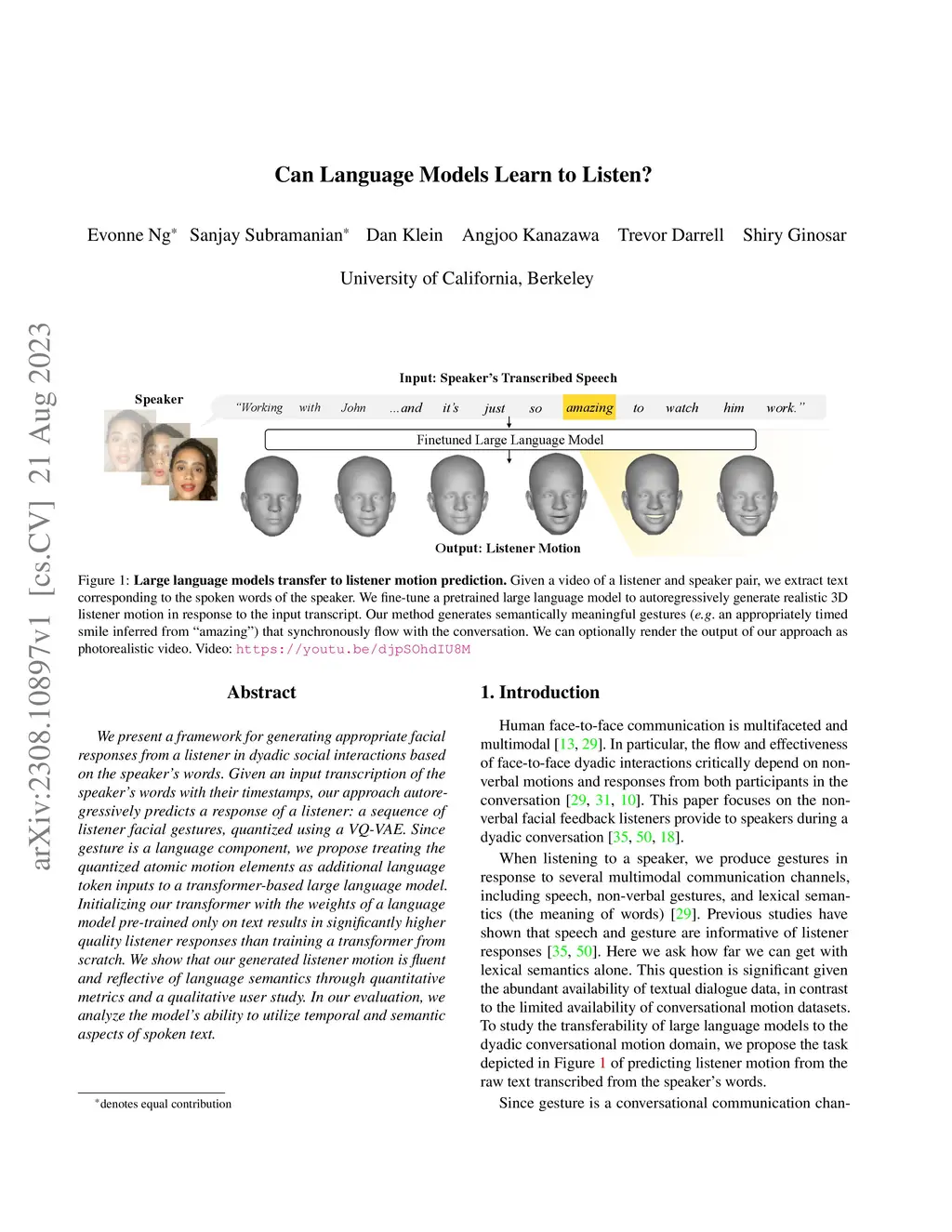We present a framework for generating appropriate facial responses from a listener in dyadic social interactions based on the speaker's words. Given an input transcription of the speaker's words with their timestamps, our approach autoregressively predicts a response of a listener: a sequence of listener facial gestures, quantized using a VQ-VAE. Since gesture is a language component, we propose treating the quantized atomic motion elements as additional language token inputs to a transformer-based large language model. Initializing our transformer with the weights of a language model pre-trained only on text results in significantly higher quality listener responses than training a transformer from scratch. We show that our generated listener motion is fluent and reflective of language semantics through quantitative metrics and a qualitative user study. In our evaluation, we analyze the model's ability to utilize temporal and semantic aspects of spoken text. Project page: https://people.eecs.berkeley.edu/~evonne_ng/projects/text2listen/