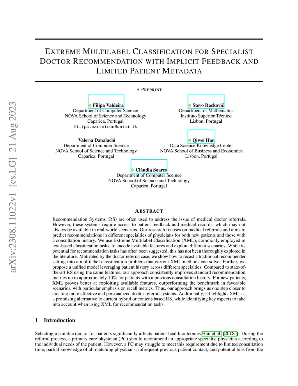 Recommendation Systems (RS) are often used to address the issue of medical doctor referrals. However, these systems require access to patient feedback and medical records, which may not always be available in real-world scenarios. Our research focuses on medical referrals and aims to predict recommendations in different specialties of physicians for both new patients and those with a consultation history. We use Extreme Multilabel Classification (XML), commonly employed in text-based classification tasks, to encode available features and explore different scenarios. While its potential for recommendation tasks has often been suggested, this has not been thoroughly explored in the literature. Motivated by the doctor referral case, we show how to recast a traditional recommender setting into a multilabel classification problem that current XML methods can solve. Further, we propose a unified model leveraging patient history across different specialties. Compared to state-of-the-art RS using the same features, our approach consistently improves standard recommendation metrics up to approximately for patients with a previous consultation history. For new patients, XML proves better at exploiting available features, outperforming the benchmark in favorable scenarios, with particular emphasis on recall metrics. Thus, our approach brings us one step closer to creating more effective and personalized doctor referral systems. Additionally, it highlights XML as a promising alternative to current hybrid or content-based RS, while identifying key aspects to take into account when using XML for recommendation tasks.