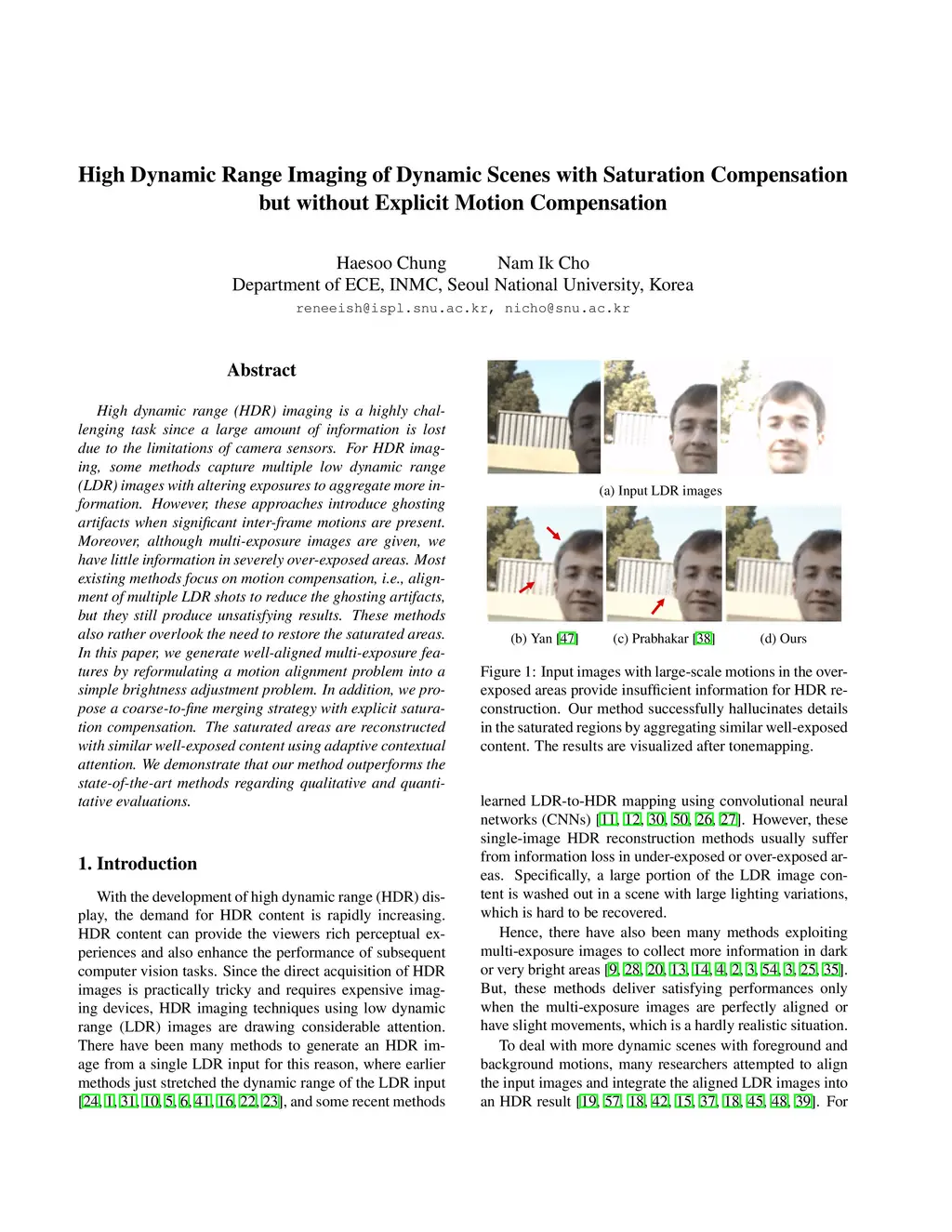High dynamic range (HDR) imaging is a highly challenging task since a large amount of information is lost due to the limitations of camera sensors. For HDR imaging, some methods capture multiple low dynamic range (LDR) images with altering exposures to aggregate more information. However, these approaches introduce ghosting artifacts when significant inter-frame motions are present. Moreover, although multi-exposure images are given, we have little information in severely over-exposed areas. Most existing methods focus on motion compensation, i.e., alignment of multiple LDR shots to reduce the ghosting artifacts, but they still produce unsatisfying results. These methods also rather overlook the need to restore the saturated areas. In this paper, we generate well-aligned multi-exposure features by reformulating a motion alignment problem into a simple brightness adjustment problem. In addition, we propose a coarse-to-fine merging strategy with explicit saturation compensation. The saturated areas are reconstructed with similar well-exposed content using adaptive contextual attention. We demonstrate that our method outperforms the state-of-the-art methods regarding qualitative and quantitative evaluations.