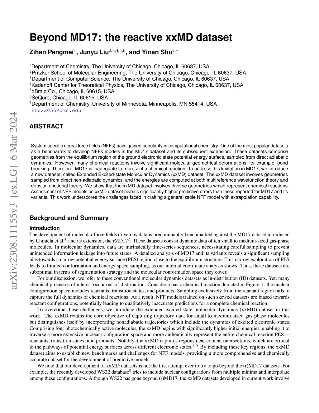 Neural force fields (NFFs) have gained prominence in computational chemistry as surrogate models, superseding quantum-chemistry calculations in ab initio molecular dynamics. The prevalent benchmark for NFFs has been the MD17 dataset and its subsequent extension. These datasets predominantly comprise geometries from the equilibrium region of the ground electronic state potential energy surface, sampling from direct adiabatic dynamics. However, many chemical reactions entail significant molecular deformations, notably bond breaking. We demonstrate the constrained distribution of internal coordinates and energies in the MD17 datasets, underscoring their inadequacy for representing systems undergoing chemical reactions. Addressing this sampling limitation, we introduce the xxMD (Extended Excited-state Molecular Dynamics) dataset, derived from non-adiabatic dynamics. This dataset encompasses energies and forces ascertained from both multireference wave function theory and density functional theory. Furthermore, its nuclear configuration spaces authentically depict chemical reactions, making xxMD a more chemically relevant dataset. Our re-assessment of equivariant models on the xxMD datasets reveals notably higher mean absolute errors than those reported for MD17 and its variants. This observation underscores the challenges faced in crafting a generalizable NFF model with extrapolation capability. Our proposed xxMD-CASSCF and xxMD-DFT datasets are available at \url{https://github.com/zpengmei/xxMD}.