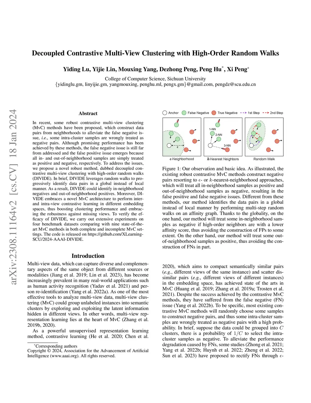 In recent, some robust contrastive multi-view clustering (MvC) methods have been proposed, which construct data pairs from neighborhoods to alleviate the false negative issue, i.e., some intra-cluster samples are wrongly treated as negative pairs. Although promising performance has been achieved by these methods, the false negative issue is still far from addressed and the false positive issue emerges because all in- and out-of-neighborhood samples are simply treated as positive and negative, respectively. To address the issues, we propose a novel robust method, dubbed decoupled contrastive multi-view clustering with high-order random walks (DIVIDE). In brief, DIVIDE leverages random walks to progressively identify data pairs in a global instead of local manner. As a result, DIVIDE could identify in-neighborhood negatives and out-of-neighborhood positives. Moreover, DIVIDE embraces a novel MvC architecture to perform inter- and intra-view contrastive learning in different embedding spaces, thus boosting clustering performance and embracing the robustness against missing views. To verify the efficacy of DIVIDE, we carry out extensive experiments on four benchmark datasets comparing with nine state-of-the-art MvC methods in both complete and incomplete MvC settings.