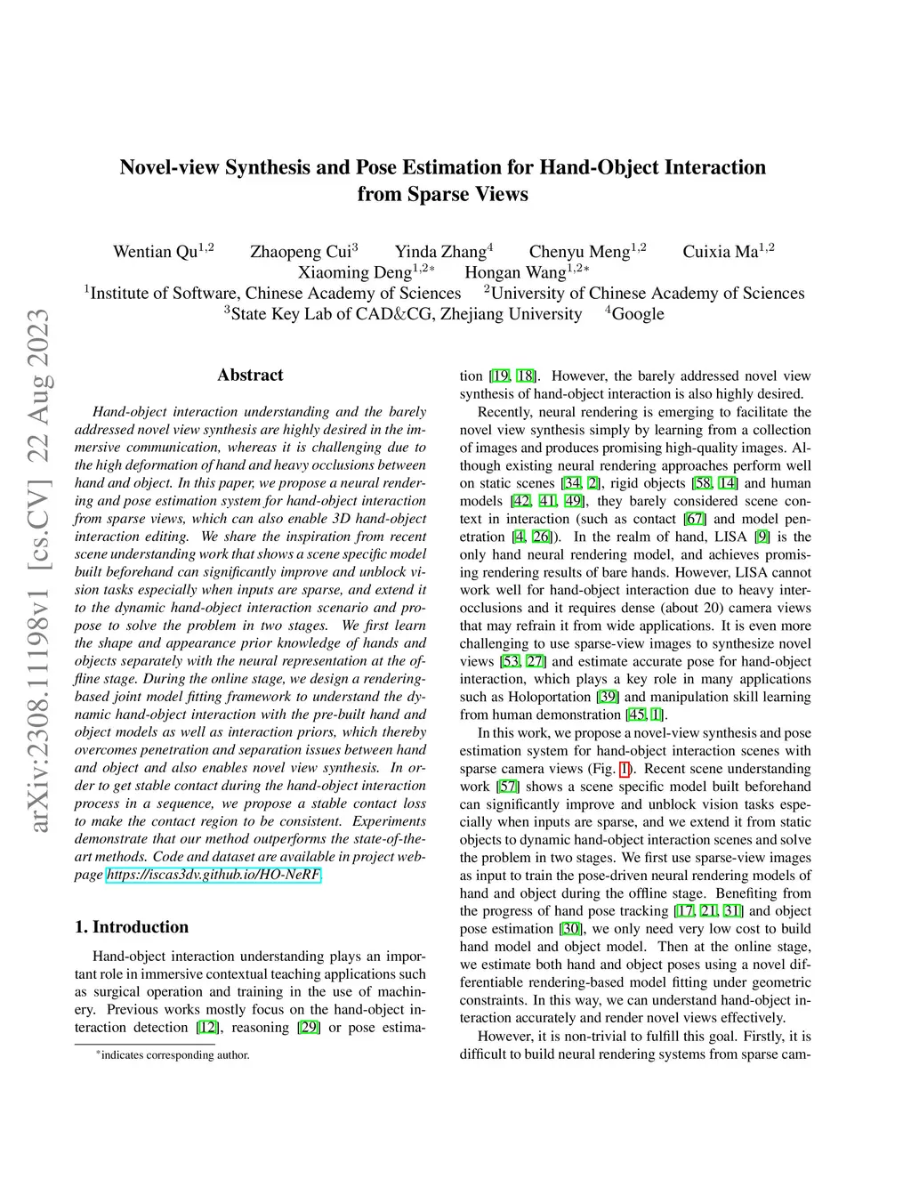 Novel-view Synthesis and Pose Estimation for Hand-Object Interaction
