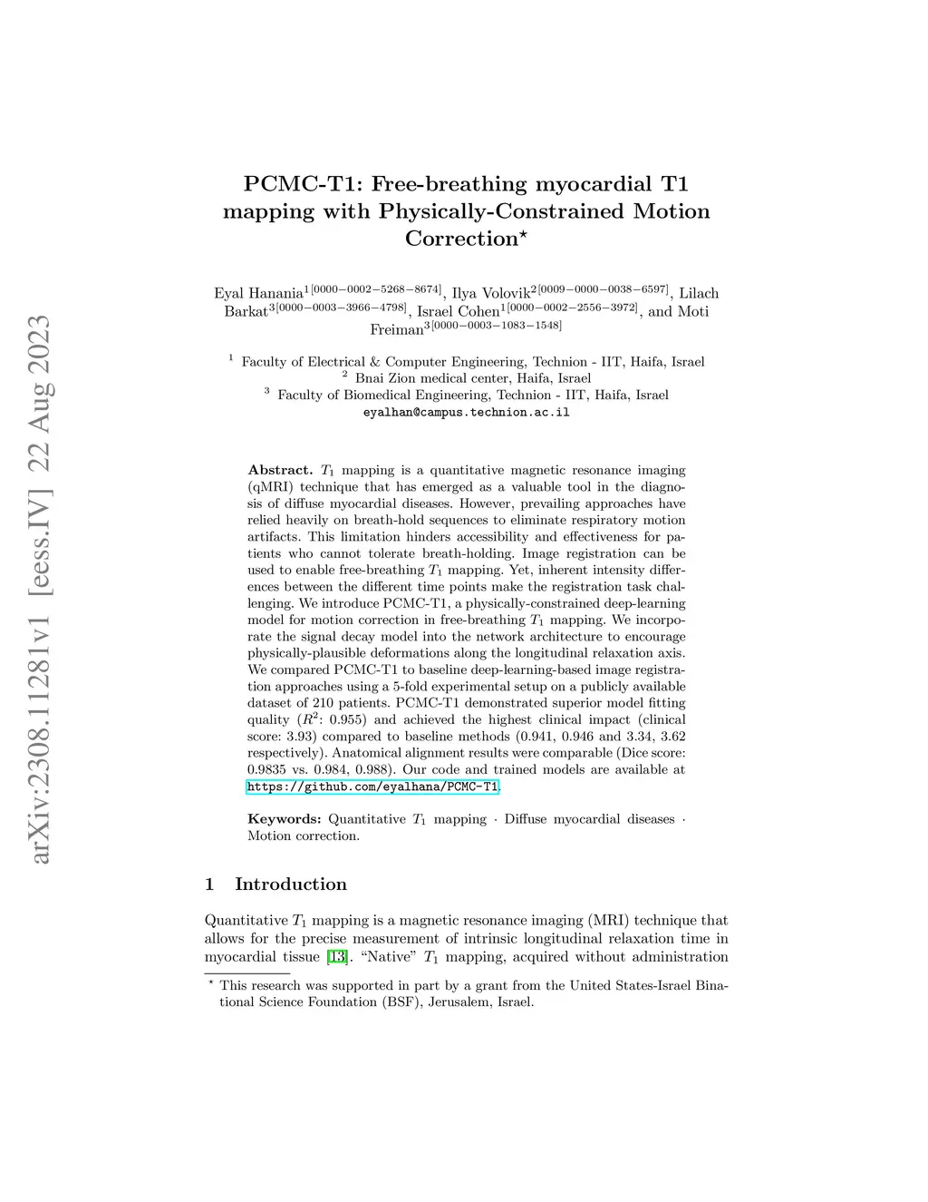 PCMC-T1: Free-breathing myocardial T1 mapping with