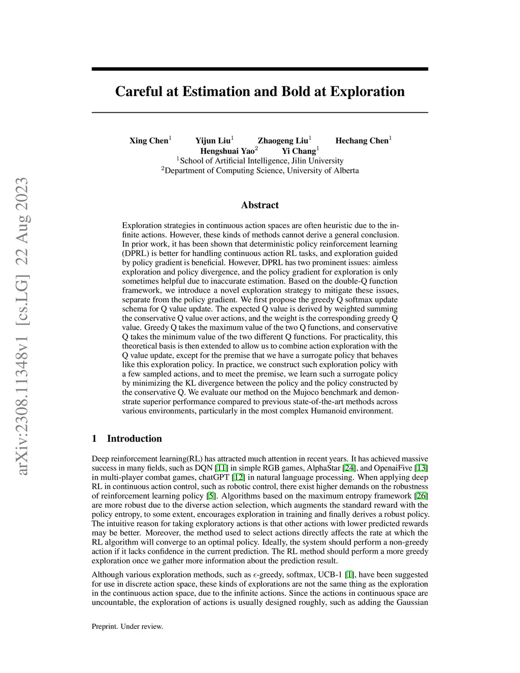 Exploration strategies in continuous action space are often heuristic due to the infinite actions, and these kinds of methods cannot derive a general conclusion. In prior work, it has been shown that policy-based exploration is beneficial for continuous action space in deterministic policy reinforcement learning(DPRL). However, policy-based exploration in DPRL has two prominent issues: aimless exploration and policy divergence, and the policy gradient for exploration is only sometimes helpful due to inaccurate estimation. Based on the double-Q function framework, we introduce a novel exploration strategy to mitigate these issues, separate from the policy gradient. We first propose the greedy Q softmax update schema for Q value update. The expected Q value is derived by weighted summing the conservative Q value over actions, and the weight is the corresponding greedy Q value. Greedy Q takes the maximum value of the two Q functions, and conservative Q takes the minimum value of the two different Q functions. For practicality, this theoretical basis is then extended to allow us to combine action exploration with the Q value update, except for the premise that we have a surrogate policy that behaves like this exploration policy. In practice, we construct such an exploration policy with a few sampled actions, and to meet the premise, we learn such a surrogate policy by minimizing the KL divergence between the target policy and the exploration policy constructed by the conservative Q. We evaluate our method on the Mujoco benchmark and demonstrate superior performance compared to previous state-of-the-art methods across various environments, particularly in the most complex Humanoid environment.
