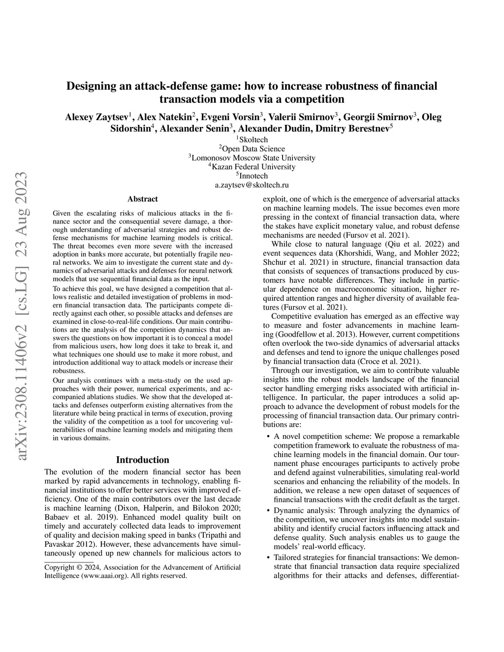 Given the escalating risks of malicious attacks in the finance sector and the consequential severe damage, a thorough understanding of adversarial strategies and robust defense mechanisms for machine learning models is critical. The threat becomes even more severe with the increased adoption in banks more accurate, but potentially fragile neural networks. We aim to investigate the current state and dynamics of adversarial attacks and defenses for neural network models that use sequential financial data as the input. To achieve this goal, we have designed a competition that allows realistic and detailed investigation of problems in modern financial transaction data. The participants compete directly against each other, so possible attacks and defenses are examined in close-to-real-life conditions. Our main contributions are the analysis of the competition dynamics that answers the questions on how important it is to conceal a model from malicious users, how long does it take to break it, and what techniques one should use to make it more robust, and introduction additional way to attack models or increase their robustness. Our analysis continues with a meta-study on the used approaches with their power, numerical experiments, and accompanied ablations studies. We show that the developed attacks and defenses outperform existing alternatives from the literature while being practical in terms of execution, proving the validity of the competition as a tool for uncovering vulnerabilities of machine learning models and mitigating them in various domains.