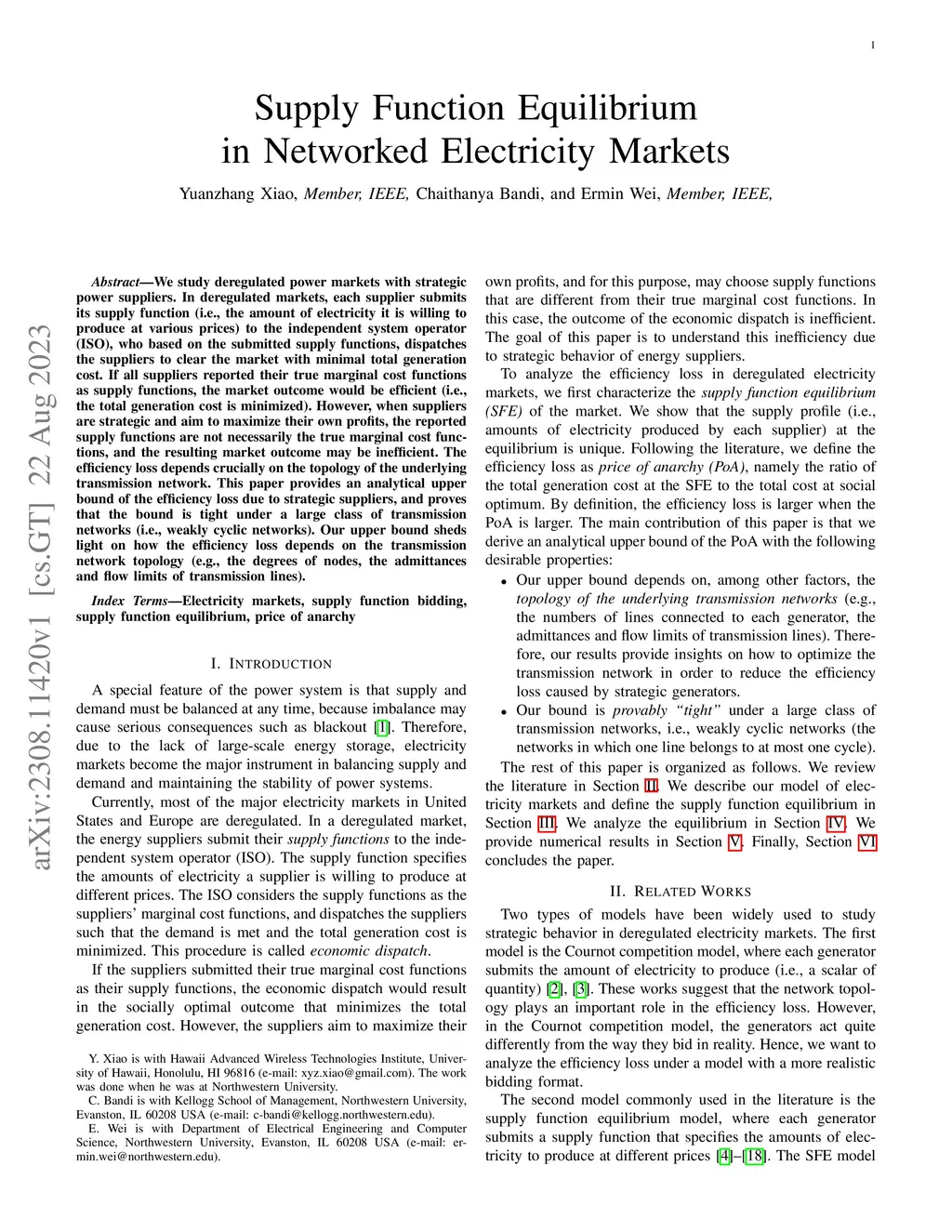 We study deregulated power markets with strategic power suppliers. In deregulated markets, each supplier submits its supply function (i.e., the amount of electricity it is willing to produce at various prices) to the independent system operator (ISO), who based on the submitted supply functions, dispatches the suppliers to clear the market with minimal total generation cost. If all suppliers reported their true marginal cost functions as supply functions, the market outcome would be efficient (i.e., the total generation cost is minimized). However, when suppliers are strategic and aim to maximize their own profits, the reported supply functions are not necessarily the true marginal cost functions, and the resulting market outcome may be inefficient. The efficiency loss depends crucially on the topology of the underlying transmission network. This paper provides an analytical upper bound of the efficiency loss due to strategic suppliers, and proves that the bound is tight under a large class of transmission networks (i.e., weakly cyclic networks). Our upper bound sheds light on how the efficiency loss depends on the transmission network topology (e.g., the degrees of nodes, the admittances and flow limits of transmission lines).