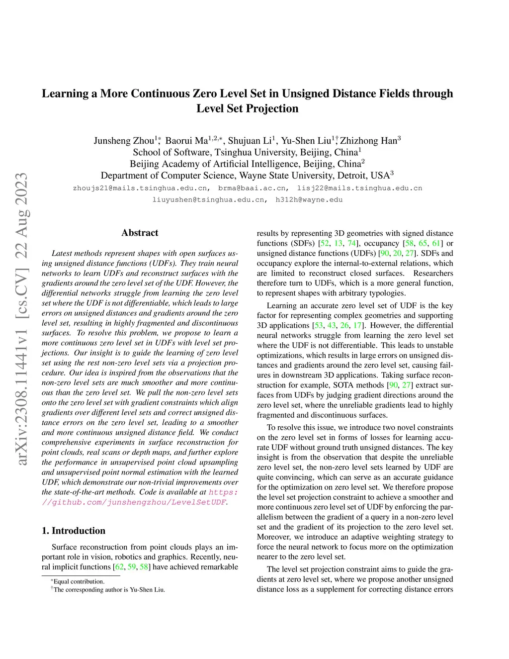 Latest methods represent shapes with open surfaces using unsigned distance functions (UDFs). They train neural networks to learn UDFs and reconstruct surfaces with the gradients around the zero level set of the UDF. However, the differential networks struggle from learning the zero level set where the UDF is not differentiable, which leads to large errors on unsigned distances and gradients around the zero level set, resulting in highly fragmented and discontinuous surfaces. To resolve this problem, we propose to learn a more continuous zero level set in UDFs with level set projections. Our insight is to guide the learning of zero level set using the rest non-zero level sets via a projection procedure. Our idea is inspired from the observations that the non-zero level sets are much smoother and more continuous than the zero level set. We pull the non-zero level sets onto the zero level set with gradient constraints which align gradients over different level sets and correct unsigned distance errors on the zero level set, leading to a smoother and more continuous unsigned distance field. We conduct comprehensive experiments in surface reconstruction for point clouds, real scans or depth maps, and further explore the performance in unsupervised point cloud upsampling and unsupervised point normal estimation with the learned UDF, which demonstrate our non-trivial improvements over the state-of-the-art methods. Code is available at https://github.com/junshengzhou/LevelSetUDF .