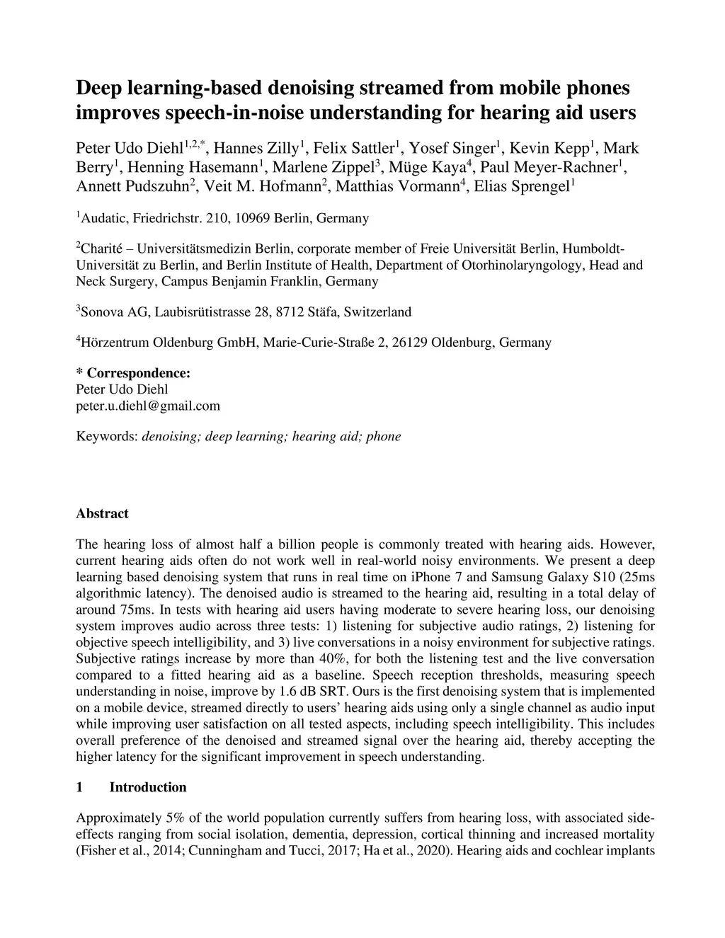 The hearing loss of almost half a billion people is commonly treated with hearing aids. However, current hearing aids often do not work well in real-world noisy environments. We present a deep learning based denoising system that runs in real time on iPhone 7 and Samsung Galaxy S10 (25ms algorithmic latency). The denoised audio is streamed to the hearing aid, resulting in a total delay of around 75ms. In tests with hearing aid users having moderate to severe hearing loss, our denoising system improves audio across three tests: 1) listening for subjective audio ratings, 2) listening for objective speech intelligibility, and 3) live conversations in a noisy environment for subjective ratings. Subjective ratings increase by more than 40%, for both the listening test and the live conversation compared to a fitted hearing aid as a baseline. Speech reception thresholds, measuring speech understanding in noise, improve by 1.6 dB SRT. Ours is the first denoising system that is implemented on a mobile device, streamed directly to users' hearing aids using only a single channel as audio input while improving user satisfaction on all tested aspects, including speech intelligibility. This includes overall preference of the denoised and streamed signal over the hearing aid, thereby accepting the higher latency for the significant improvement in speech understanding.