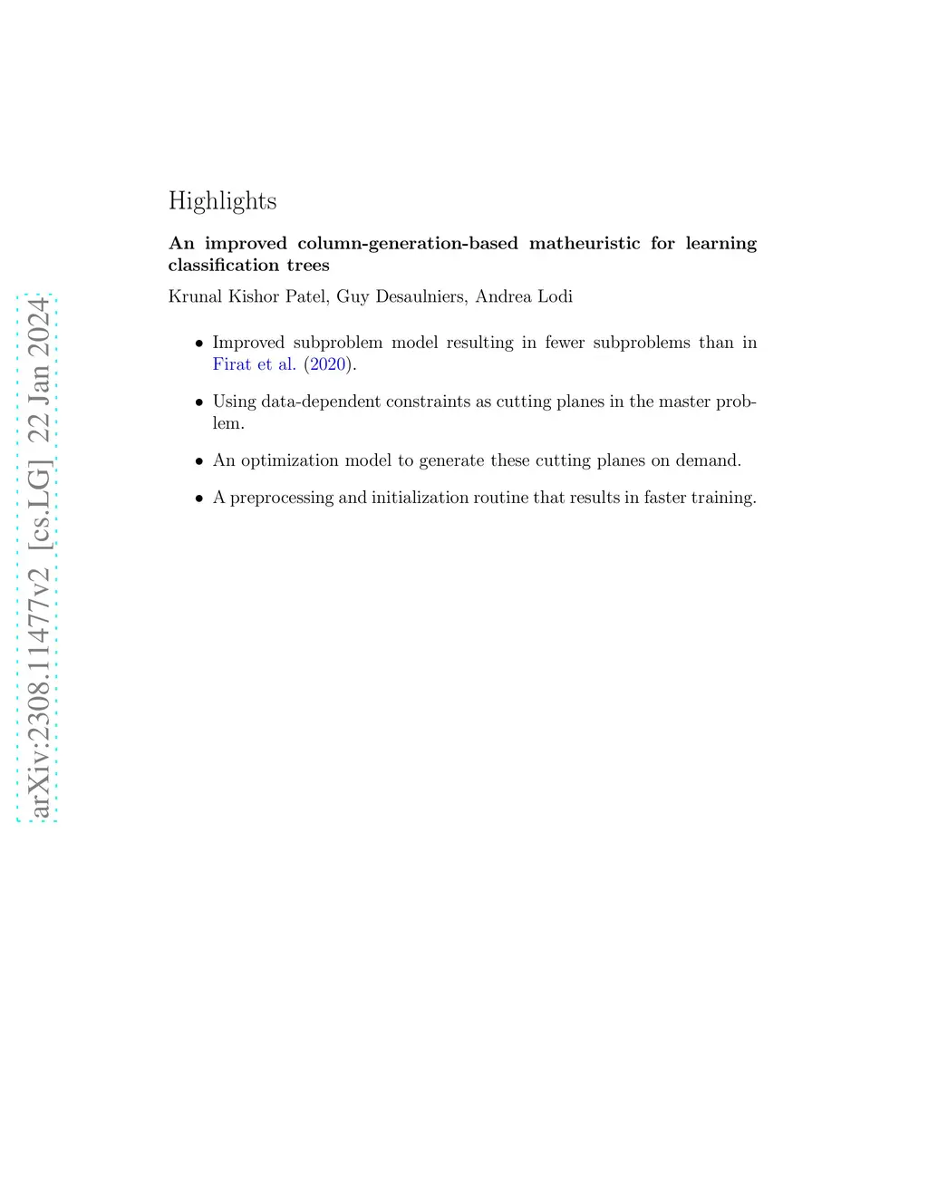 Decision trees are highly interpretable models for solving classification problems in machine learning (ML). The standard ML algorithms for training decision trees are fast but generate suboptimal trees in terms of accuracy. Other discrete optimization models in the literature address the optimality problem but only work well on relatively small datasets. \cite{firat2020column} proposed a column-generation-based heuristic approach for learning decision trees. This approach improves scalability and can work with large datasets. In this paper, we describe improvements to this column generation approach. First, we modify the subproblem model to significantly reduce the number of subproblems in multiclass classification instances. Next, we show that the data-dependent constraints in the master problem are implied, and use them as cutting planes. Furthermore, we describe a separation model to generate data points for which the linear programming relaxation solution violates their corresponding constraints. We conclude by presenting computational results that show that these modifications result in better scalability.