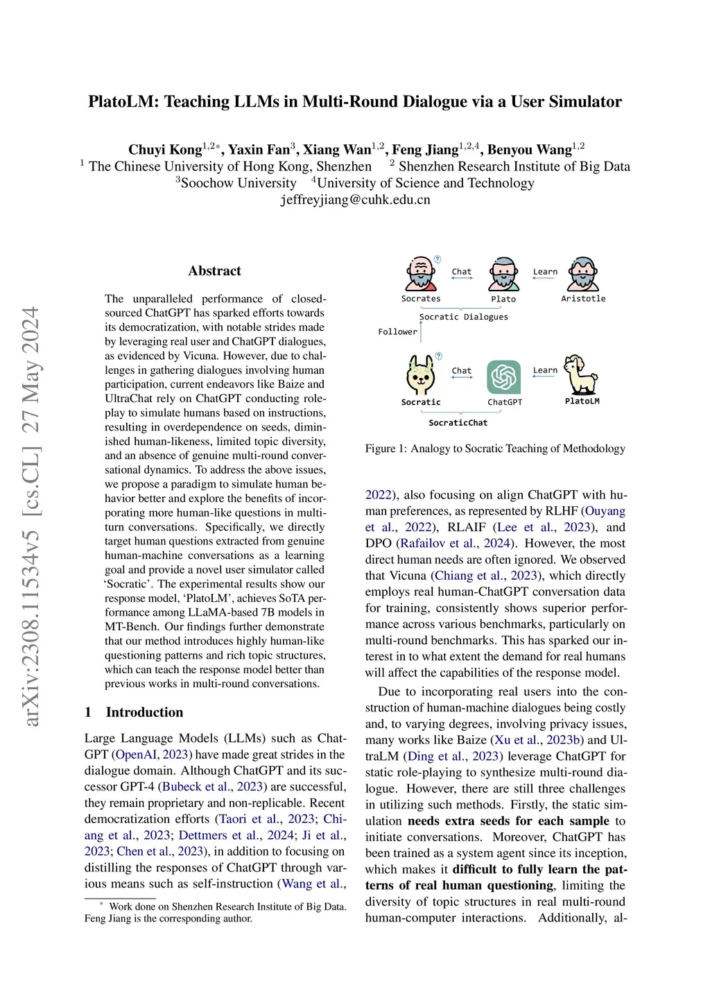 The unparalleled performance of closed-sourced ChatGPT has sparked efforts towards its democratization, with notable strides made by leveraging real user and ChatGPT dialogues, as evidenced by Vicuna. However, due to challenges in gathering dialogues involving human participation, current endeavors like Baize and UltraChat rely on ChatGPT conducting roleplay to simulate humans based on instructions, resulting in overdependence on seeds, diminished human-likeness, limited topic diversity, and an absence of genuine multi-round conversational dynamics. To address the above issues, we propose a paradigm to simulate human behavior better and explore the benefits of incorporating more human-like questions in multi-turn conversations. Specifically, we directly target human questions extracted from genuine human-machine conversations as a learning goal and provide a novel user simulator called `Socratic'. The experimental results show our response model, `PlatoLM', achieves SoTA performance among LLaMA-based 7B models in MT-Bench. Our findings further demonstrate that our method introduces highly human-like questioning patterns and rich topic structures, which can teach the response model better than previous works in multi-round conversations.