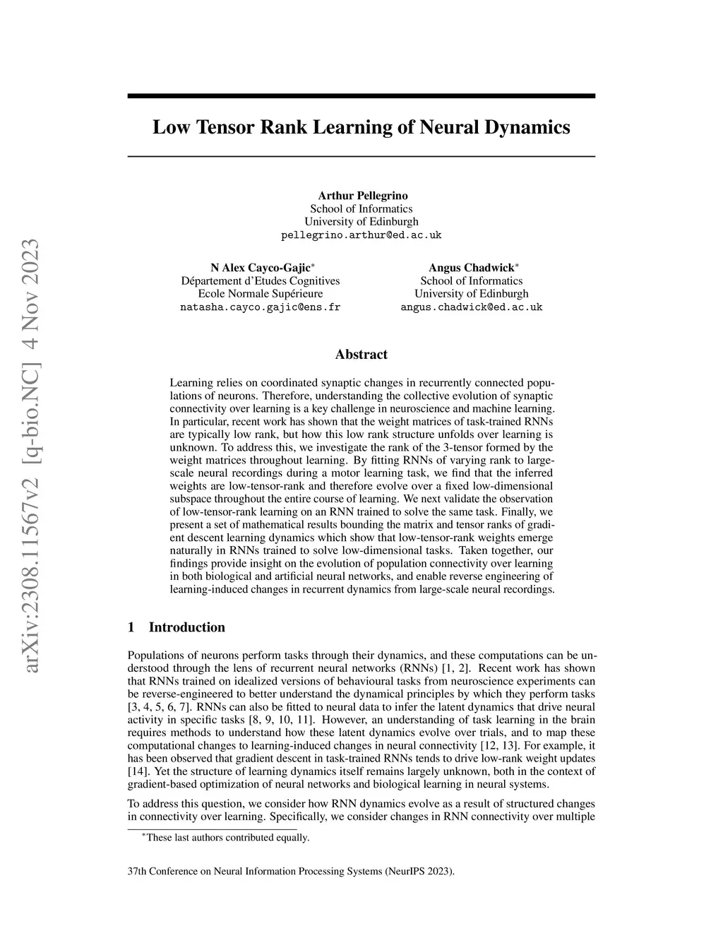 Learning relies on coordinated synaptic changes in recurrently connected populations of neurons. Therefore, understanding the collective evolution of synaptic connectivity over learning is a key challenge in neuroscience and machine learning. In particular, recent work has shown that the weight matrices of task-trained RNNs are typically low rank, but how this low rank structure unfolds over learning is unknown. To address this, we investigate the rank of the 3-tensor formed by the weight matrices throughout learning. By fitting RNNs of varying rank to large-scale neural recordings during a motor learning task, we find that the inferred weights are low-tensor-rank and therefore evolve over a fixed low-dimensional subspace throughout the entire course of learning. We next validate the observation of low-tensor-rank learning on an RNN trained to solve the same task. Finally, we present a set of mathematical results bounding the matrix and tensor ranks of gradient descent learning dynamics which show that low-tensor-rank weights emerge naturally in RNNs trained to solve low-dimensional tasks. Taken together, our findings provide insight on the evolution of population connectivity over learning in both biological and artificial neural networks, and enable reverse engineering of learning-induced changes in recurrent dynamics from large-scale neural recordings.