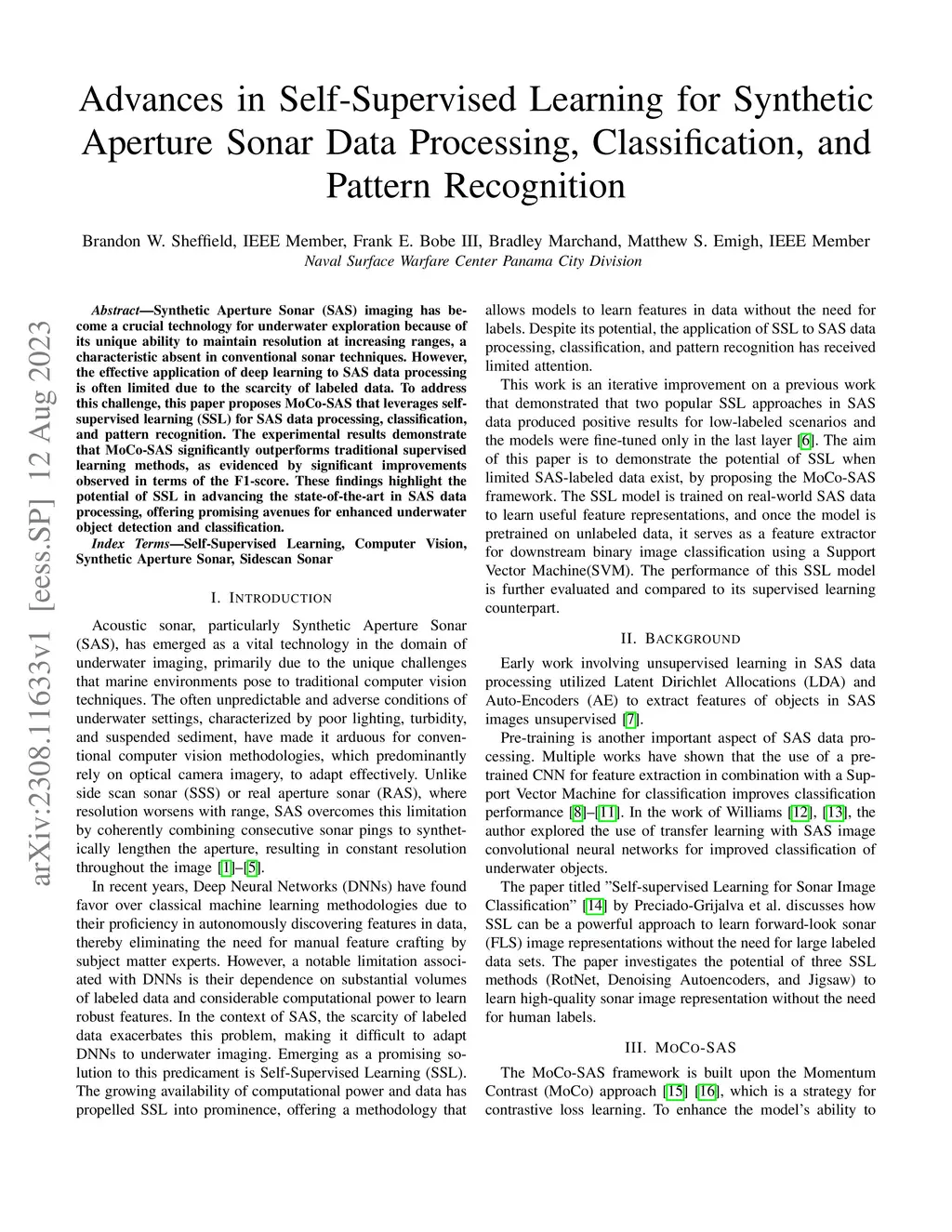 Synthetic Aperture Sonar (SAS) imaging has become a crucial technology for underwater exploration because of its unique ability to maintain resolution at increasing ranges, a characteristic absent in conventional sonar techniques. However, the effective application of deep learning to SAS data processing is often limited due to the scarcity of labeled data. To address this challenge, this paper proposes MoCo-SAS that leverages self-supervised learning (SSL) for SAS data processing, classification, and pattern recognition. The experimental results demonstrate that MoCo-SAS significantly outperforms traditional supervised learning methods, as evidenced by significant improvements observed in terms of the F1-score. These findings highlight the potential of SSL in advancing the state-of-the-art in SAS data processing, offering promising avenues for enhanced underwater object detection and classification.