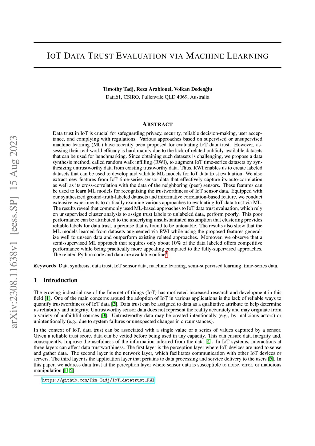 Various approaches based on supervised or unsupervised machine learning (ML) have been proposed for evaluating IoT data trust. However, assessing their real-world efficacy is hard mainly due to the lack of related publicly-available datasets that can be used for benchmarking. Since obtaining such datasets is challenging, we propose a data synthesis method, called random walk infilling (RWI), to augment IoT time-series datasets by synthesizing untrustworthy data from existing trustworthy data. Thus, RWI enables us to create labeled datasets that can be used to develop and validate ML models for IoT data trust evaluation. We also extract new features from IoT time-series sensor data that effectively capture its auto-correlation as well as its cross-correlation with the data of the neighboring (peer) sensors. These features can be used to learn ML models for recognizing the trustworthiness of IoT sensor data. Equipped with our synthesized ground-truth-labeled datasets and informative correlation-based feature, we conduct extensive experiments to critically examine various approaches to evaluating IoT data trust via ML. The results reveal that commonly used ML-based approaches to IoT data trust evaluation, which rely on unsupervised cluster analysis to assign trust labels to unlabeled data, perform poorly. This poor performance can be attributed to the underlying unsubstantiated assumption that clustering provides reliable labels for data trust, a premise that is found to be untenable. The results also show that the ML models learned from datasets augmented via RWI while using the proposed features generalize well to unseen data and outperform existing related approaches. Moreover, we observe that a semi-supervised ML approach that requires only about 10% of the data labeled offers competitive performance while being practically more appealing compared to the fully-supervised approaches.