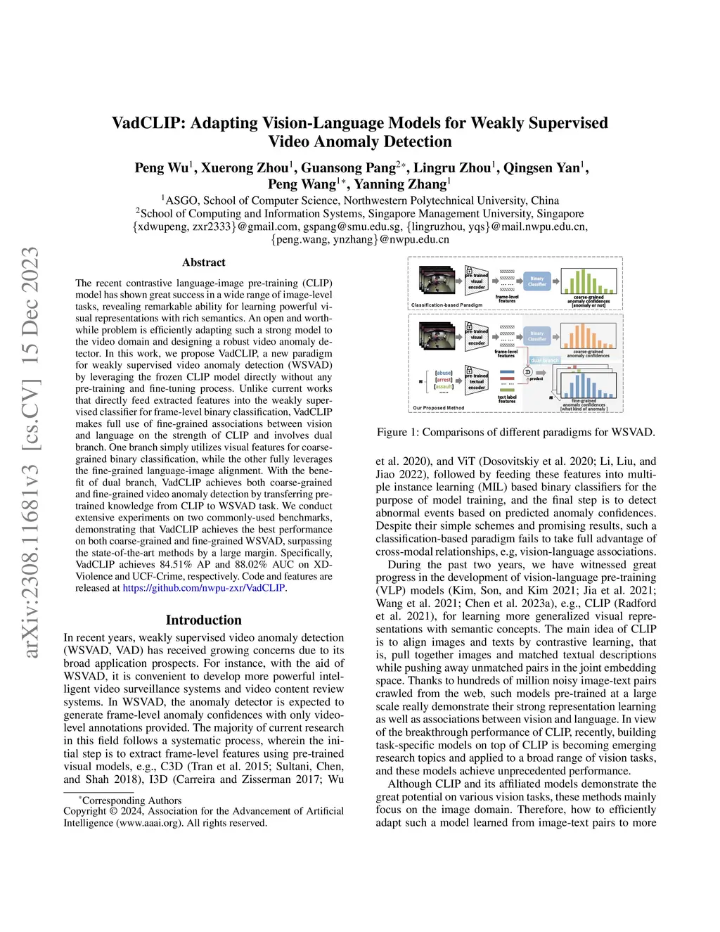 VadCLIP: Adapting Vision-Language Models for Weakly Supervised Video