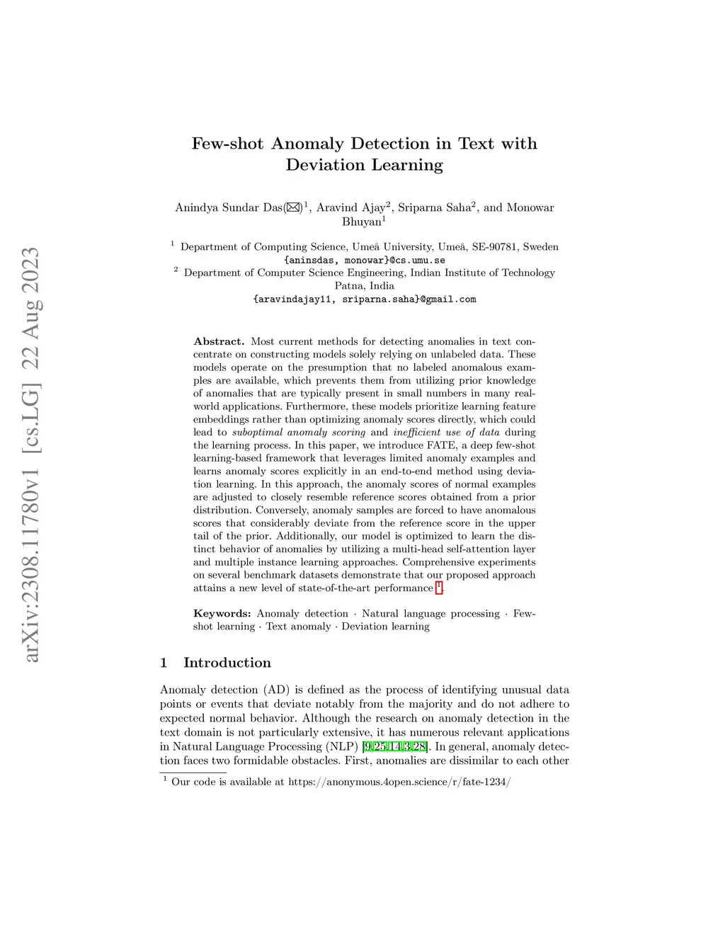 Most current methods for detecting anomalies in text concentrate on constructing models solely relying on unlabeled data. These models operate on the presumption that no labeled anomalous examples are available, which prevents them from utilizing prior knowledge of anomalies that are typically present in small numbers in many real-world applications. Furthermore, these models prioritize learning feature embeddings rather than optimizing anomaly scores directly, which could lead to suboptimal anomaly scoring and inefficient use of data during the learning process. In this paper, we introduce FATE, a deep few-shot learning-based framework that leverages limited anomaly examples and learns anomaly scores explicitly in an end-to-end method using deviation learning. In this approach, the anomaly scores of normal examples are adjusted to closely resemble reference scores obtained from a prior distribution. Conversely, anomaly samples are forced to have anomalous scores that considerably deviate from the reference score in the upper tail of the prior. Additionally, our model is optimized to learn the distinct behavior of anomalies by utilizing a multi-head self-attention layer and multiple instance learning approaches. Comprehensive experiments on several benchmark datasets demonstrate that our proposed approach attains a new level of state-of-the-art performance.