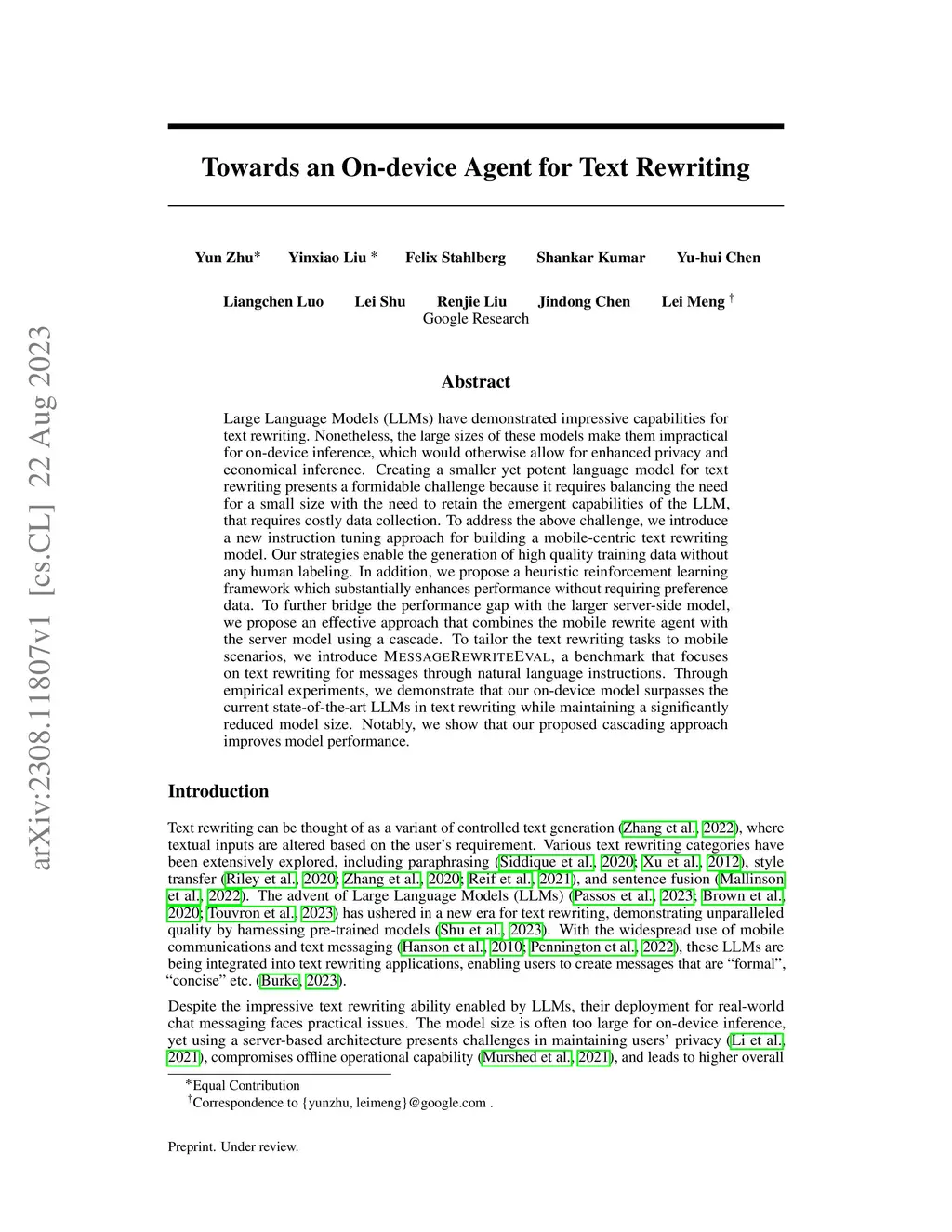 Large Language Models (LLMs) have demonstrated impressive capabilities for text rewriting. Nonetheless, the large sizes of these models make them impractical for on-device inference, which would otherwise allow for enhanced privacy and economical inference. Creating a smaller yet potent language model for text rewriting presents a formidable challenge because it requires balancing the need for a small size with the need to retain the emergent capabilities of the LLM, that requires costly data collection. To address the above challenge, we introduce a new instruction tuning approach for building a mobile-centric text rewriting model. Our strategies enable the generation of high quality training data without any human labeling. In addition, we propose a heuristic reinforcement learning framework which substantially enhances performance without requiring preference data. To further bridge the performance gap with the larger server-side model, we propose an effective approach that combines the mobile rewrite agent with the server model using a cascade. To tailor the text rewriting tasks to mobile scenarios, we introduce MessageRewriteEval, a benchmark that focuses on text rewriting for messages through natural language instructions. Through empirical experiments, we demonstrate that our on-device model surpasses the current state-of-the-art LLMs in text rewriting while maintaining a significantly reduced model size. Notably, we show that our proposed cascading approach improves model performance.