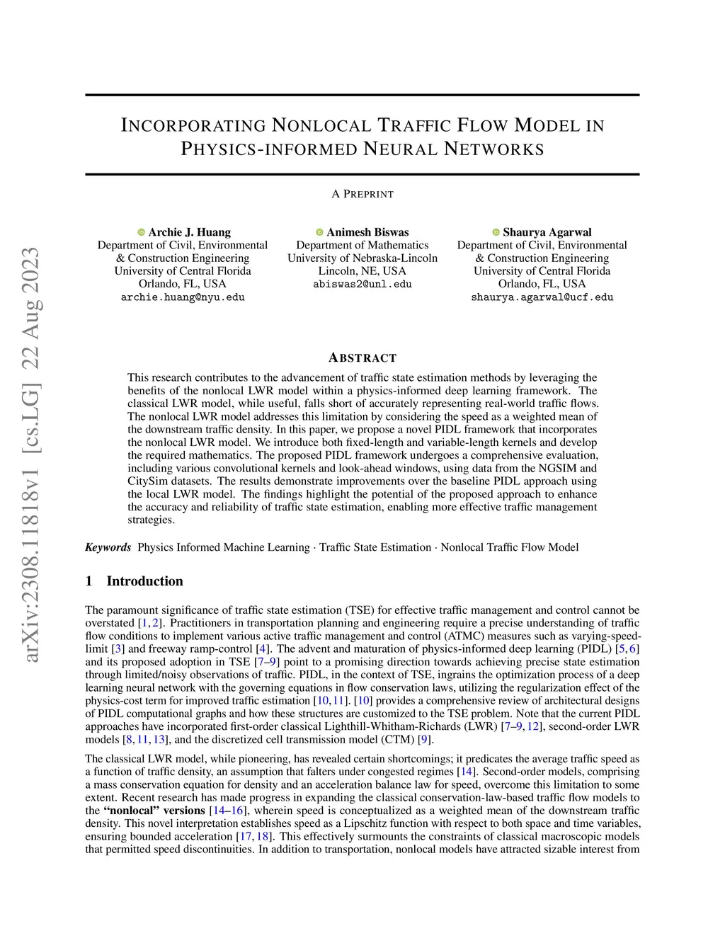 This research contributes to the advancement of traffic state estimation methods by leveraging the benefits of the nonlocal LWR model within a physics-informed deep learning framework. The classical LWR model, while useful, falls short of accurately representing real-world traffic flows. The nonlocal LWR model addresses this limitation by considering the speed as a weighted mean of the downstream traffic density. In this paper, we propose a novel PIDL framework that incorporates the nonlocal LWR model. We introduce both fixed-length and variable-length kernels and develop the required mathematics. The proposed PIDL framework undergoes a comprehensive evaluation, including various convolutional kernels and look-ahead windows, using data from the NGSIM and CitySim datasets. The results demonstrate improvements over the baseline PIDL approach using the local LWR model. The findings highlight the potential of the proposed approach to enhance the accuracy and reliability of traffic state estimation, enabling more effective traffic management strategies.