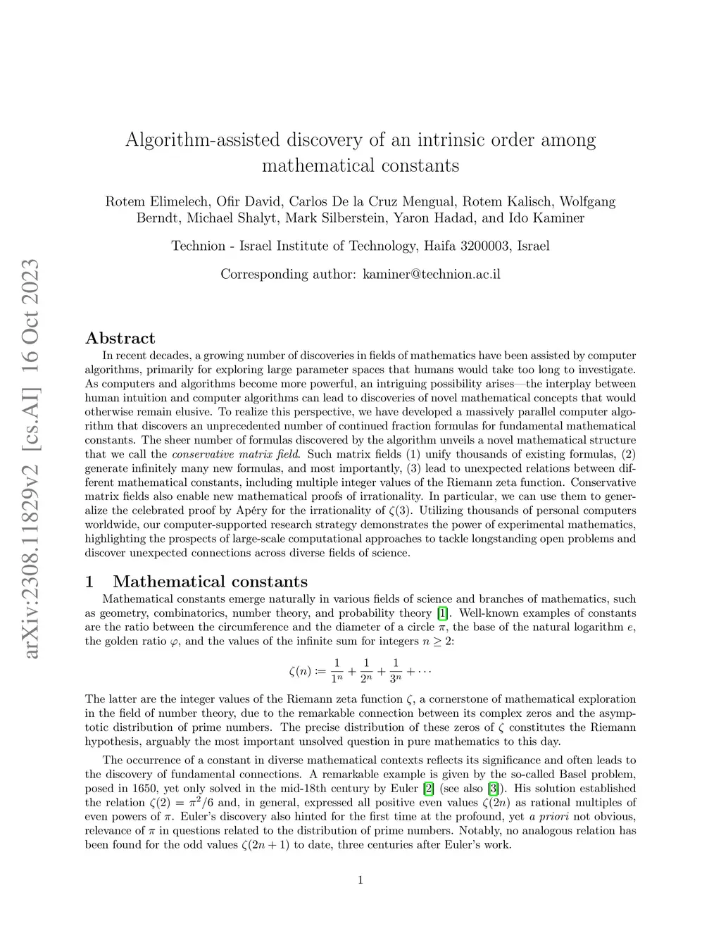 In recent decades, a growing number of discoveries in fields of mathematics have been assisted by computer algorithms, primarily for exploring large parameter spaces that humans would take too long to investigate. As computers and algorithms become more powerful, an intriguing possibility arises - the interplay between human intuition and computer algorithms can lead to discoveries of novel mathematical concepts that would otherwise remain elusive. To realize this perspective, we have developed a massively parallel computer algorithm that discovers an unprecedented number of continued fraction formulas for fundamental mathematical constants. The sheer number of formulas discovered by the algorithm unveils a novel mathematical structure that we call the conservative matrix field. Such matrix fields (1) unify thousands of existing formulas, (2) generate infinitely many new formulas, and most importantly, (3) lead to unexpected relations between different mathematical constants, including multiple integer values of the Riemann zeta function. Conservative matrix fields also enable new mathematical proofs of irrationality. In particular, we can use them to generalize the celebrated proof by Ap\éry for the irrationality of . Utilizing thousands of personal computers worldwide, our computer-supported research strategy demonstrates the power of experimental mathematics, highlighting the prospects of large-scale computational approaches to tackle longstanding open problems and discover unexpected connections across diverse fields of science.
