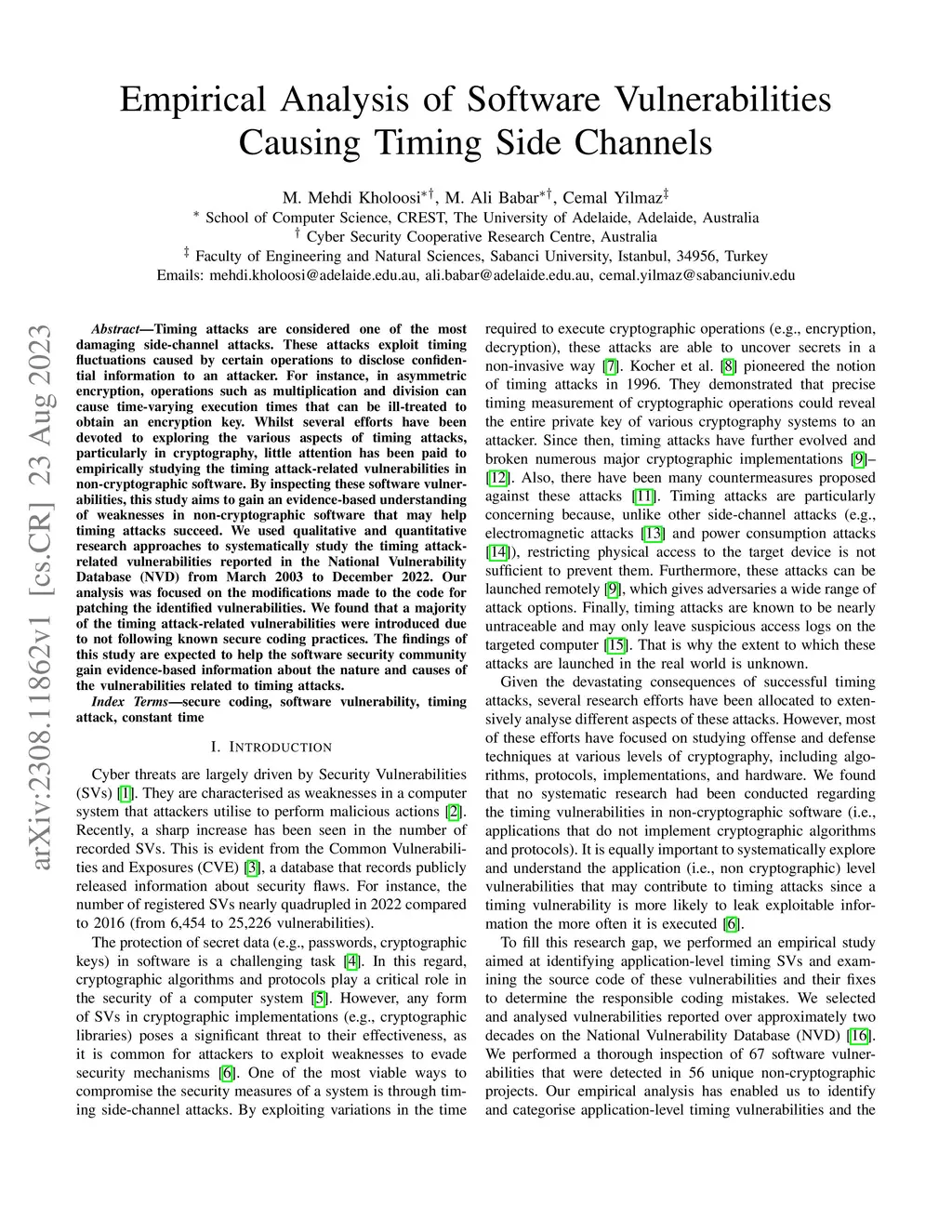 Empirical Analysis of Software Vulnerabilities Causing Timing Side