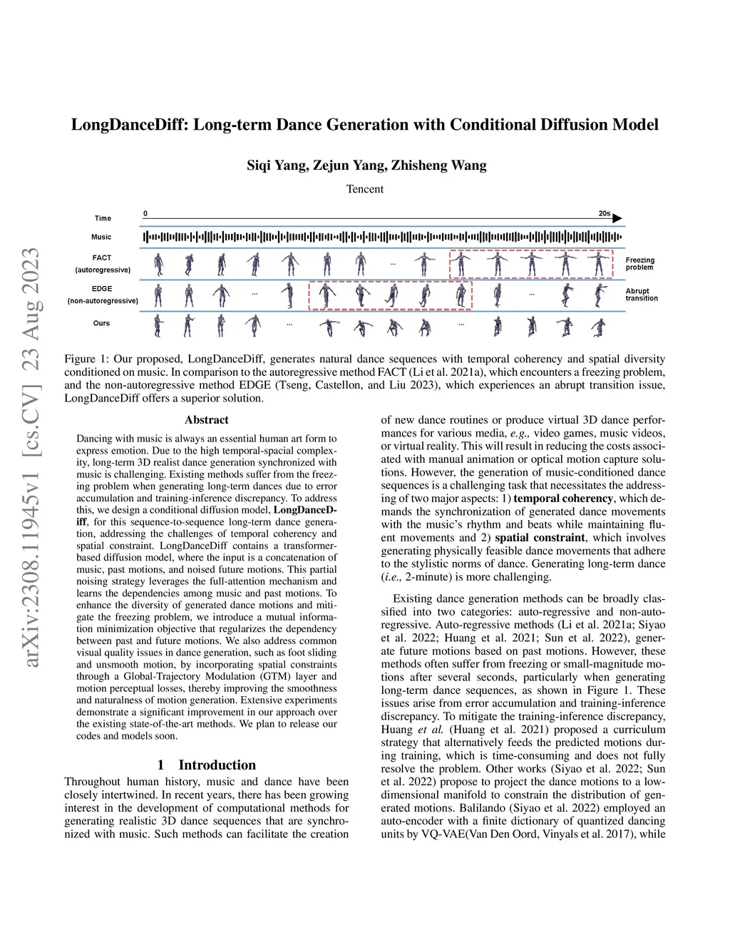 Dancing with music is always an essential human art form to express emotion. Due to the high temporal-spacial complexity, long-term 3D realist dance generation synchronized with music is challenging. Existing methods suffer from the freezing problem when generating long-term dances due to error accumulation and training-inference discrepancy. To address this, we design a conditional diffusion model, LongDanceDiff, for this sequence-to-sequence long-term dance generation, addressing the challenges of temporal coherency and spatial constraint. LongDanceDiff contains a transformer-based diffusion model, where the input is a concatenation of music, past motions, and noised future motions. This partial noising strategy leverages the full-attention mechanism and learns the dependencies among music and past motions. To enhance the diversity of generated dance motions and mitigate the freezing problem, we introduce a mutual information minimization objective that regularizes the dependency between past and future motions. We also address common visual quality issues in dance generation, such as foot sliding and unsmooth motion, by incorporating spatial constraints through a Global-Trajectory Modulation (GTM) layer and motion perceptual losses, thereby improving the smoothness and naturalness of motion generation. Extensive experiments demonstrate a significant improvement in our approach over the existing state-of-the-art methods. We plan to release our codes and models soon.