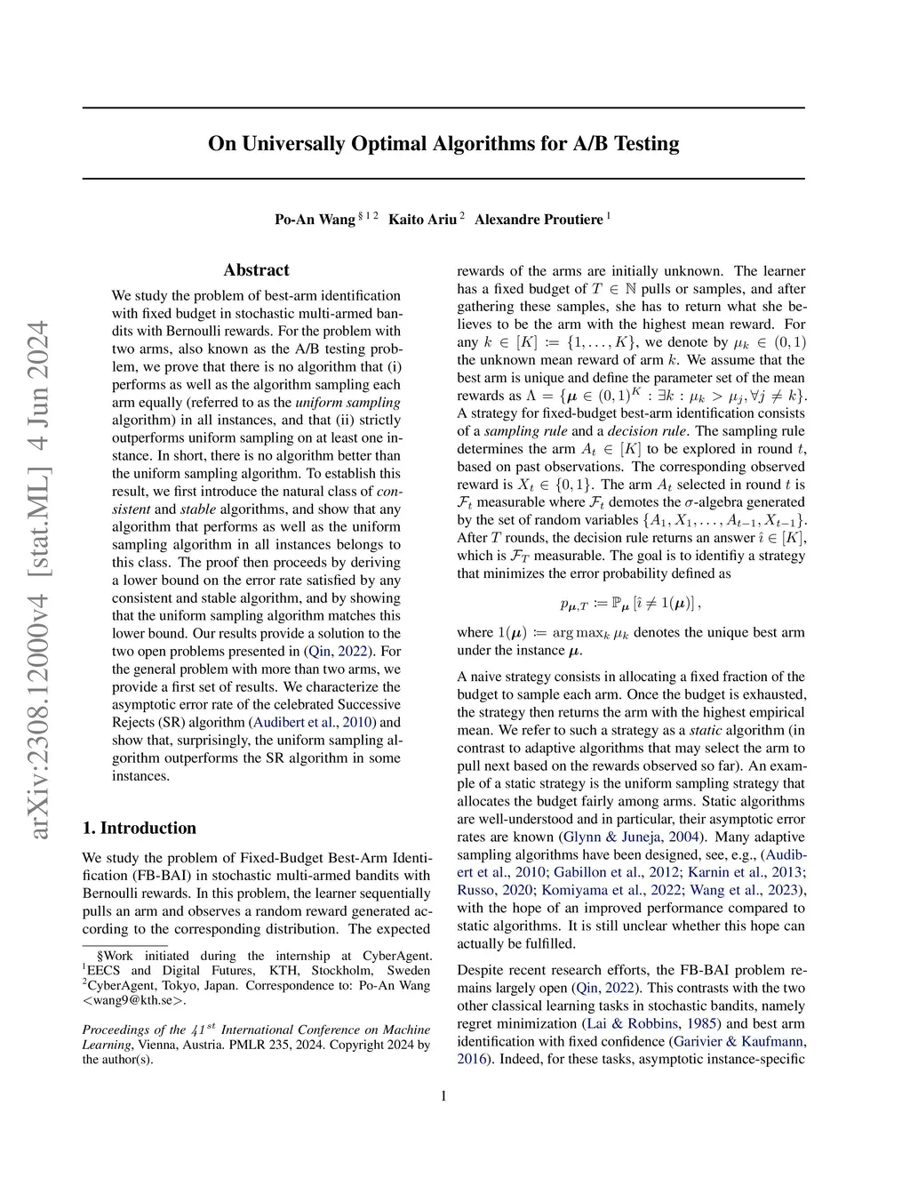 We study the problem of best-arm identification with fixed budget in stochastic multi-armed bandits with Bernoulli rewards. For the problem with two arms, also known as the A/B testing problem, we prove that there is no algorithm that (i) performs as well as the algorithm sampling each arm equally (referred to as the {\it uniform sampling} algorithm) in all instances, and that (ii) strictly outperforms uniform sampling on at least one instance. In short, there is no algorithm better than the uniform sampling algorithm. To establish this result, we first introduce the natural class of {\it consistent} and {\it stable} algorithms, and show that any algorithm that performs as well as the uniform sampling algorithm in all instances belongs to this class. The proof then proceeds by deriving a lower bound on the error rate satisfied by any consistent and stable algorithm, and by showing that the uniform sampling algorithm matches this lower bound. Our results provide a solution to the two open problems presented in \citep{qin2022open}. For the general problem with more than two arms, we provide a first set of results. We characterize the asymptotic error rate of the celebrated Successive Rejects (SR) algorithm \citep{audibert2010best} and show that, surprisingly, the uniform sampling algorithm outperforms the SR algorithm in some instances.