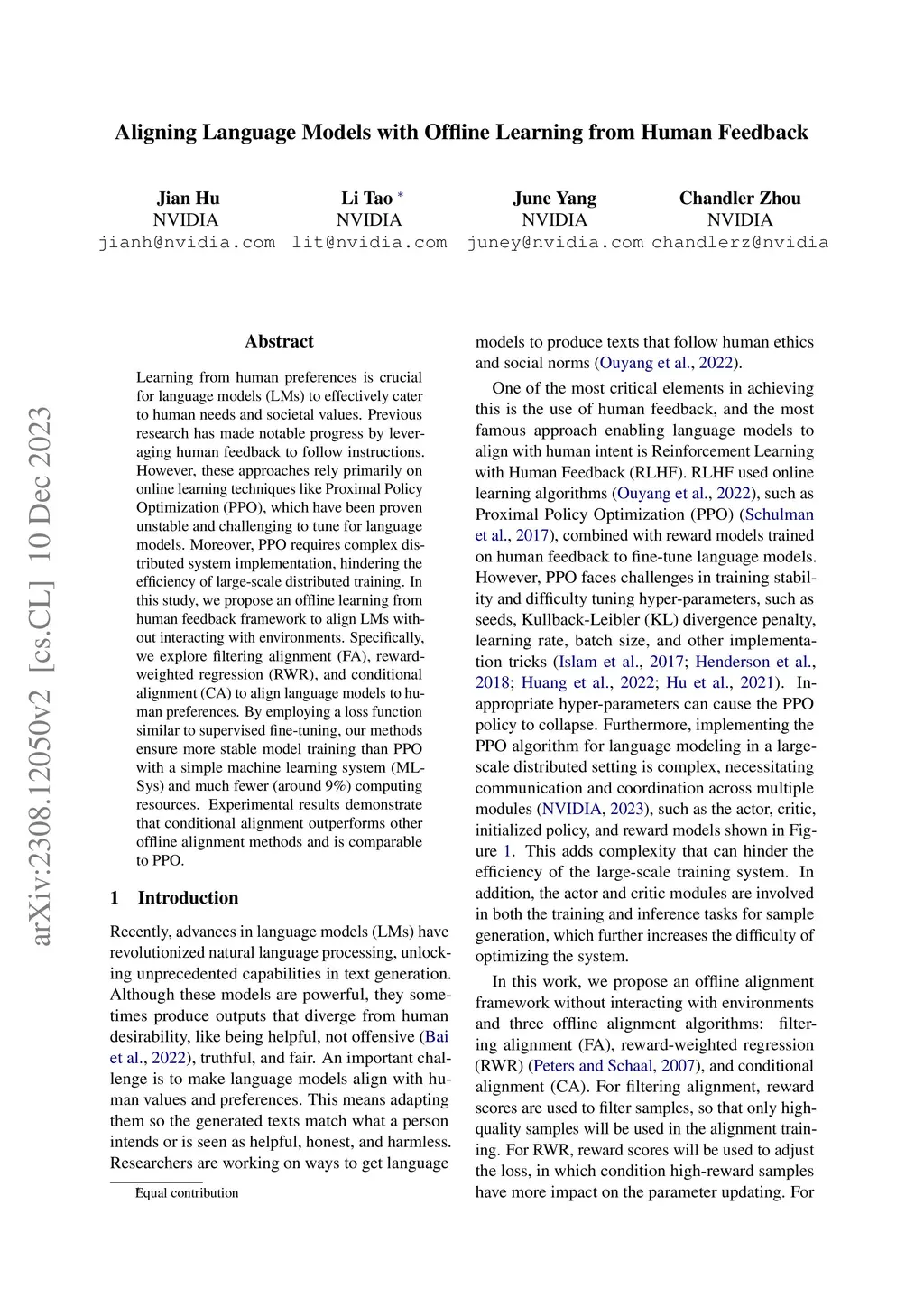 Aligning Language Models with Offline Learning from Human Feedback