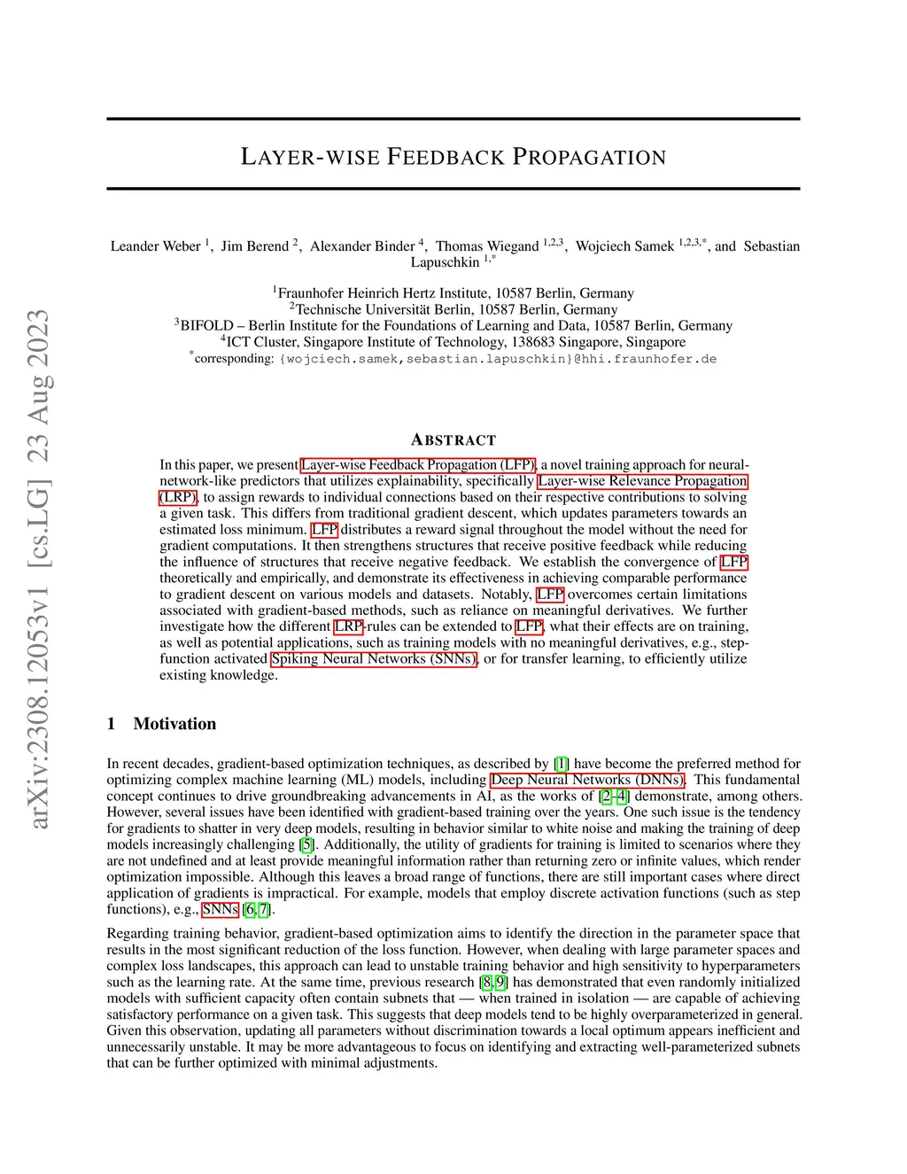 Gradient-based optimization has been a cornerstone of machine learning that enabled the vast advances of Artificial Intelligence (AI) development over the past decades. However, this type of optimization requires differentiation, and with recent evidence of the benefits of non-differentiable (e.g. neuromorphic) architectures over classical models w.r.t. efficiency, such constraints can become limiting in the future. We present Layer-wise Feedback Propagation (LFP), a novel training principle for neural network-like predictors that utilizes methods from the domain of explainability to decompose a reward to individual neurons based on their respective contributions. Leveraging these neuron-wise rewards, our method then implements a greedy approach reinforcing helpful parts of the network and weakening harmful ones. While having comparable computational complexity to gradient descent, LFP does not require gradient computation and generates sparse and thereby memory- and energy-efficient parameter updates and models. We establish the convergence of LFP theoretically and empirically, demonstrating its effectiveness on various models and datasets. Via two applications - neural network pruning and the approximation-free training of Spiking Neural Networks (SNNs) - we demonstrate that LFP combines increased efficiency in terms of computation and representation with flexibility w.r.t. choice of model architecture and objective function. Our code is available atthis https URL.