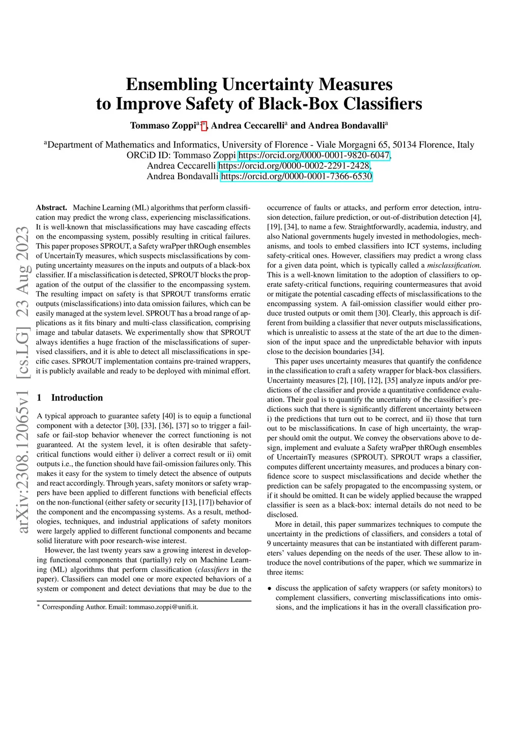 Machine Learning (ML) algorithms that perform classification may predict the wrong class, experiencing misclassifications. It is well-known that misclassifications may have cascading effects on the encompassing system, possibly resulting in critical failures. This paper proposes SPROUT, a Safety wraPper thROugh ensembles of UncertainTy measures, which suspects misclassifications by computing uncertainty measures on the inputs and outputs of a black-box classifier. If a misclassification is detected, SPROUT blocks the propagation of the output of the classifier to the encompassing system. The resulting impact on safety is that SPROUT transforms erratic outputs (misclassifications) into data omission failures, which can be easily managed at the system level. SPROUT has a broad range of applications as it fits binary and multi-class classification, comprising image and tabular datasets. We experimentally show that SPROUT always identifies a huge fraction of the misclassifications of supervised classifiers, and it is able to detect all misclassifications in specific cases. SPROUT implementation contains pre-trained wrappers, it is publicly available and ready to be deployed with minimal effort.