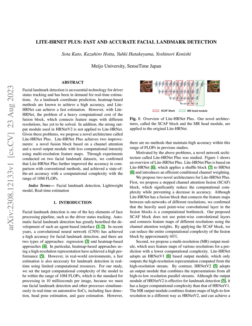 Facial landmark detection is an essential technology for driver status tracking and has been in demand for real-time estimations. As a landmark coordinate prediction, heatmap-based methods are known to achieve a high accuracy, and Lite-HRNet can achieve a fast estimation. However, with Lite-HRNet, the problem of a heavy computational cost of the fusion block, which connects feature maps with different resolutions, has yet to be solved. In addition, the strong output module used in HRNetV2 is not applied to Lite-HRNet. Given these problems, we propose a novel architecture called Lite-HRNet Plus. Lite-HRNet Plus achieves two improvements: a novel fusion block based on a channel attention and a novel output module with less computational intensity using multi-resolution feature maps. Through experiments conducted on two facial landmark datasets, we confirmed that Lite-HRNet Plus further improved the accuracy in comparison with conventional methods, and achieved a state-of-the-art accuracy with a computational complexity with the range of 10M FLOPs.