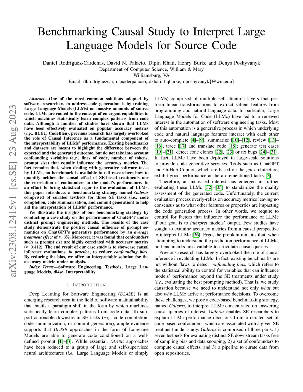 One of the most common solutions adopted by software researchers to address code generation is by training Large Language Models (LLMs) on massive amounts of source code. Although a number of studies have shown that LLMs have been effectively evaluated on popular accuracy metrics (e.g., BLEU, CodeBleu), previous research has largely overlooked the role of Causal Inference as a fundamental component of the interpretability of LLMs' performance. Existing benchmarks and datasets are meant to highlight the difference between the expected and the generated outcome, but do not take into account confounding variables (e.g., lines of code, prompt size) that equally influence the accuracy metrics. The fact remains that, when dealing with generative software tasks by LLMs, no benchmark is available to tell researchers how to quantify neither the causal effect of SE-based treatments nor the correlation of confounders to the model's performance. In an effort to bring statistical rigor to the evaluation of LLMs, this paper introduces a benchmarking strategy named Galeras comprised of curated testbeds for three SE tasks (i.e., code completion, code summarization, and commit generation) to help aid the interpretation of LLMs' performance. We illustrate the insights of our benchmarking strategy by conducting a case study on the performance of ChatGPT under distinct prompt engineering methods. The results of the case study demonstrate the positive causal influence of prompt semantics on ChatGPT's generative performance by an average treatment effect of . Moreover, it was found that confounders such as prompt size are highly correlated with accuracy metrics (). The end result of our case study is to showcase causal inference evaluations, in practice, to reduce confounding bias. By reducing the bias, we offer an interpretable solution for the accuracy metric under analysis.