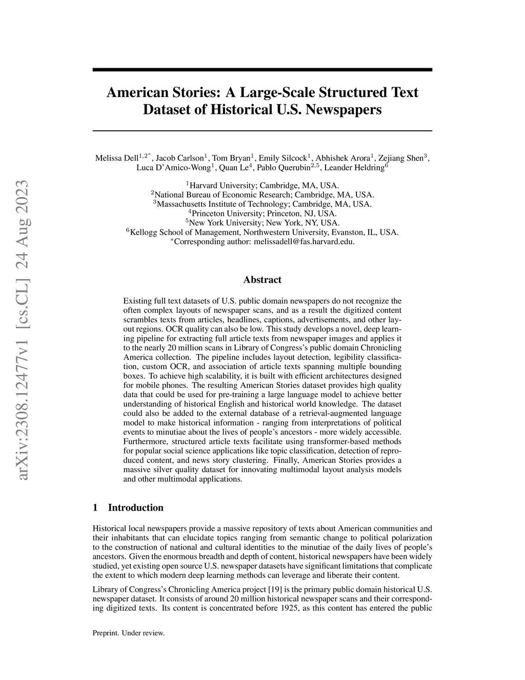 Existing full text datasets of U.S. public domain newspapers do not recognize the often complex layouts of newspaper scans, and as a result the digitized content scrambles texts from articles, headlines, captions, advertisements, and other layout regions. OCR quality can also be low. This study develops a novel, deep learning pipeline for extracting full article texts from newspaper images and applies it to the nearly 20 million scans in Library of Congress's public domain Chronicling America collection. The pipeline includes layout detection, legibility classification, custom OCR, and association of article texts spanning multiple bounding boxes. To achieve high scalability, it is built with efficient architectures designed for mobile phones. The resulting American Stories dataset provides high quality data that could be used for pre-training a large language model to achieve better understanding of historical English and historical world knowledge. The dataset could also be added to the external database of a retrieval-augmented language model to make historical information - ranging from interpretations of political events to minutiae about the lives of people's ancestors - more widely accessible. Furthermore, structured article texts facilitate using transformer-based methods for popular social science applications like topic classification, detection of reproduced content, and news story clustering. Finally, American Stories provides a massive silver quality dataset for innovating multimodal layout analysis models and other multimodal applications.